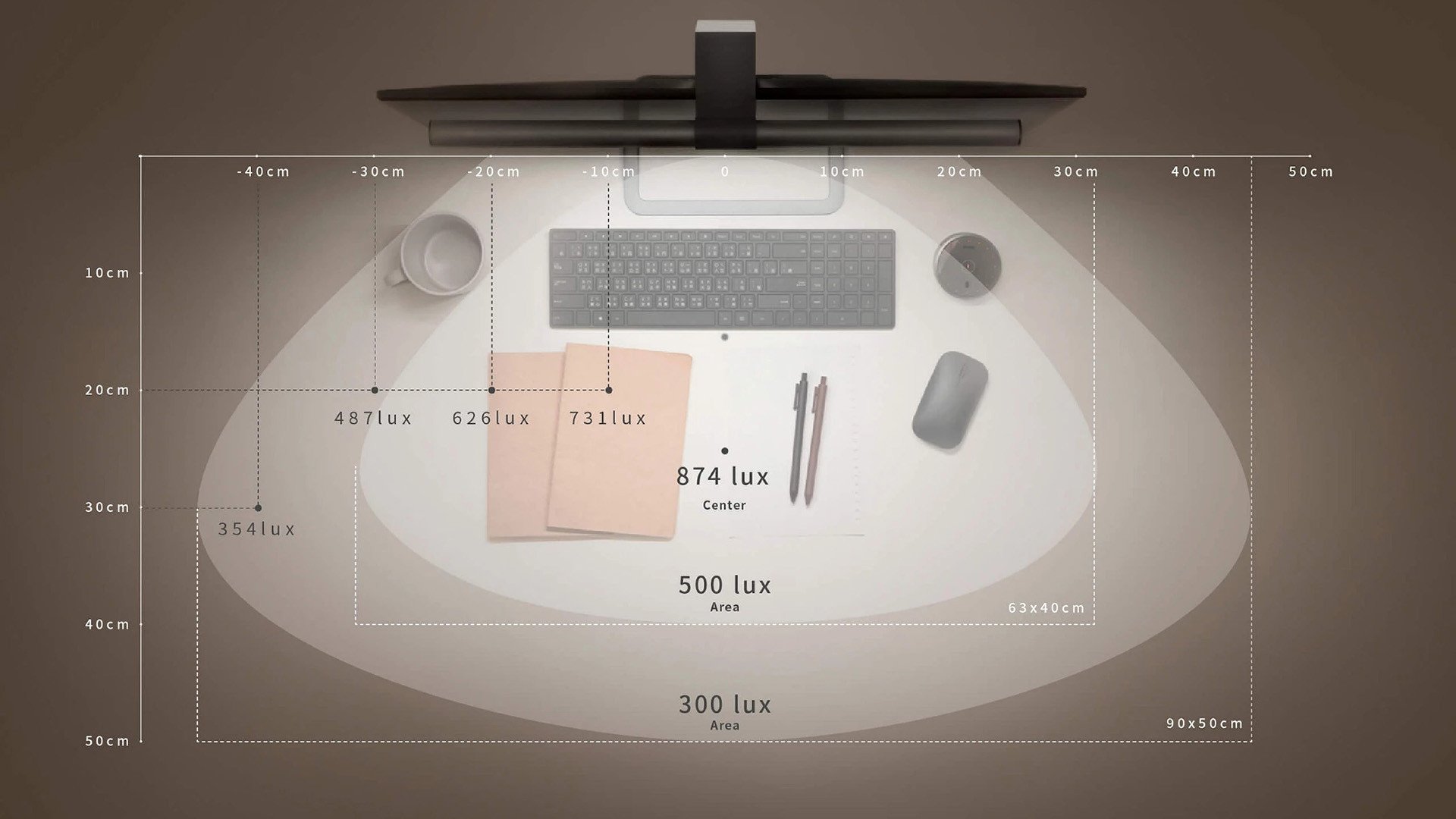 Přední světlo zajišťuje intenzivní osvícení s jasem 500 luxů na 63 × 40 cm velké ploše stolu, zabraňuje odrazu od obrazovky a snižuje účinky a nebezpečný vliv blikání a modrého světelného spektra. Integrovaný snímač okolního osvětlení automaticky upravuje jas, zatímco bezdrátový ovladač umožňuje manuální ovládání jedním dotykem včetně změny režimů.