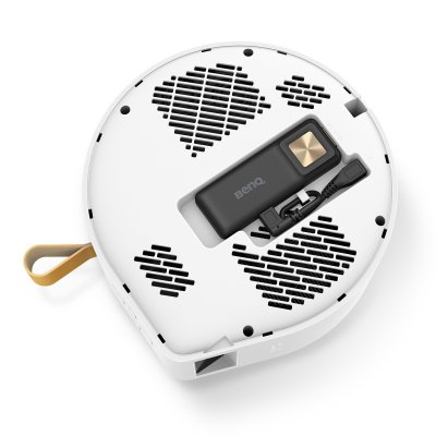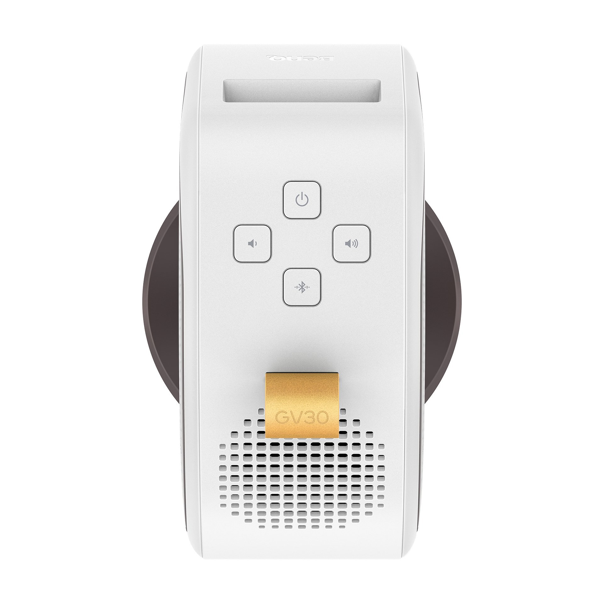 Celkově velmi malý projektor BenQ GV30 s rozměry cca 20 × 20 × 12 cm v sobě ukrývá LED zdroj s výkonem 300 ANSI lumenů a rozlišením 1 280 × 720 pixelů. Netradiční kapkovitý tvar má i svůj funkční důvod – umožňuje 135° široký úhel projekce otočením kolem horizontální osy. Kromě klasického napájecího konektoru jsou pro přenos audio a video signálu k dispozici USB-C a HDMI 1.4b.