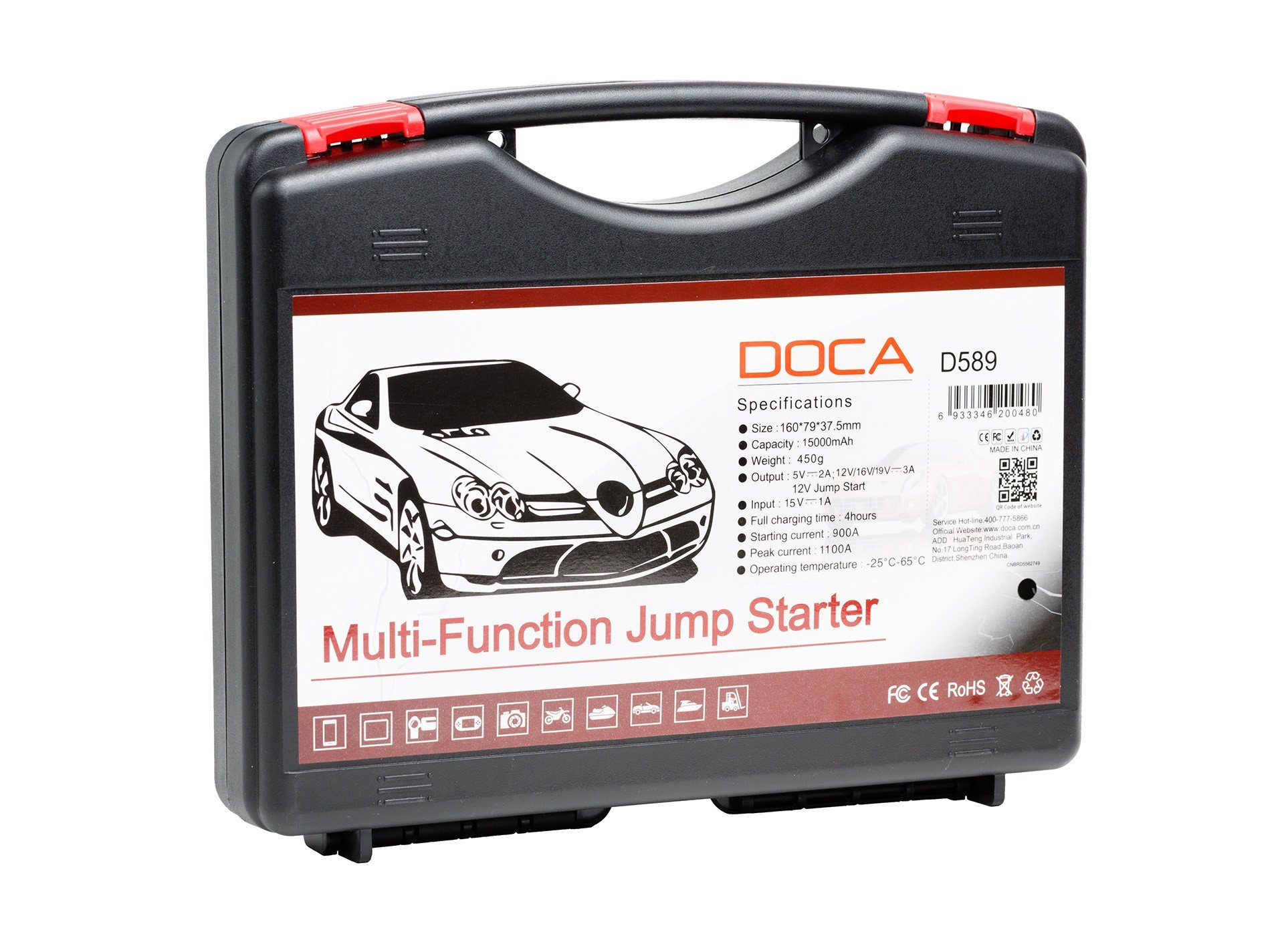 Startování automobilu trápí řidiče nejen v zimě, DOCA 15000 pomůže s 20 starty. Ne vždy je v dosahu řidič se startovacími kabely. V takových situacích je powerbanka s podporou startování automobilů neocenitelným pomocníkem. S pomocí startovacích kabelů, které jsou součástí balení, lze DOCA 15000 připojit k autobaterii a automobil tak nastartovat. Pod stanem, na festivalu i v zimě tak lze nastartovat i s vybitou autobaterií, nebo snadno pomoci ostatním bez zdlouhavého propojování automobilů.