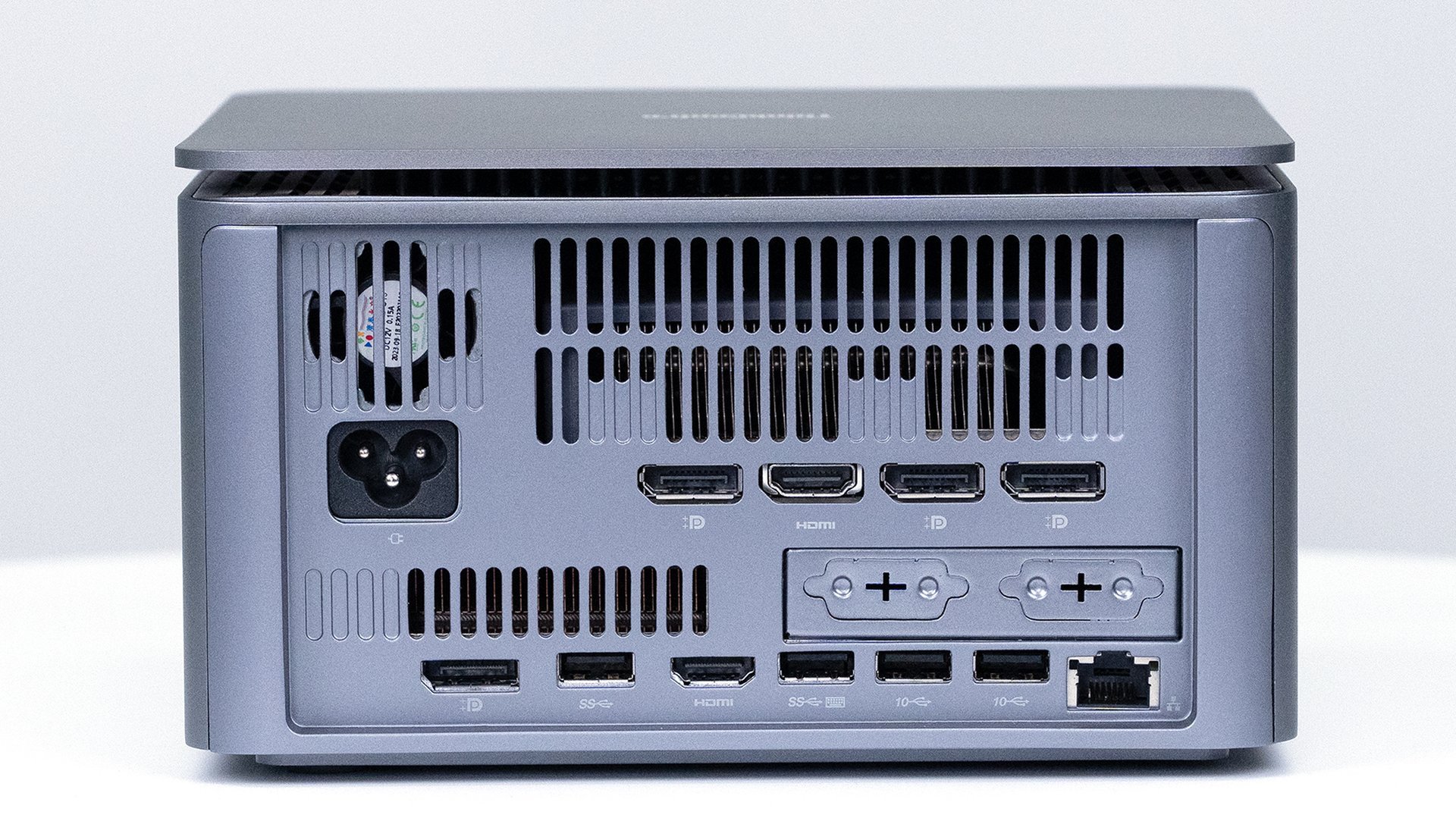 Na zadní straně našly prostor rozhraní USB-A 3.2 Gen2 (2×), 2 x USB-A 3.2 Gen1 (2×), HDMI 2.1 tmds, DP 1.4, RJ45, HDMI 2.1 (dGPU) a 3 x DP 1.4 (dGpu). Připraveny jsou také dvě pozice s možností zákaznické konfigurace, přičemž na výběr k osazení jsou rozhraní VGA, DP, HDMI, USB-C, sériové či LAN.