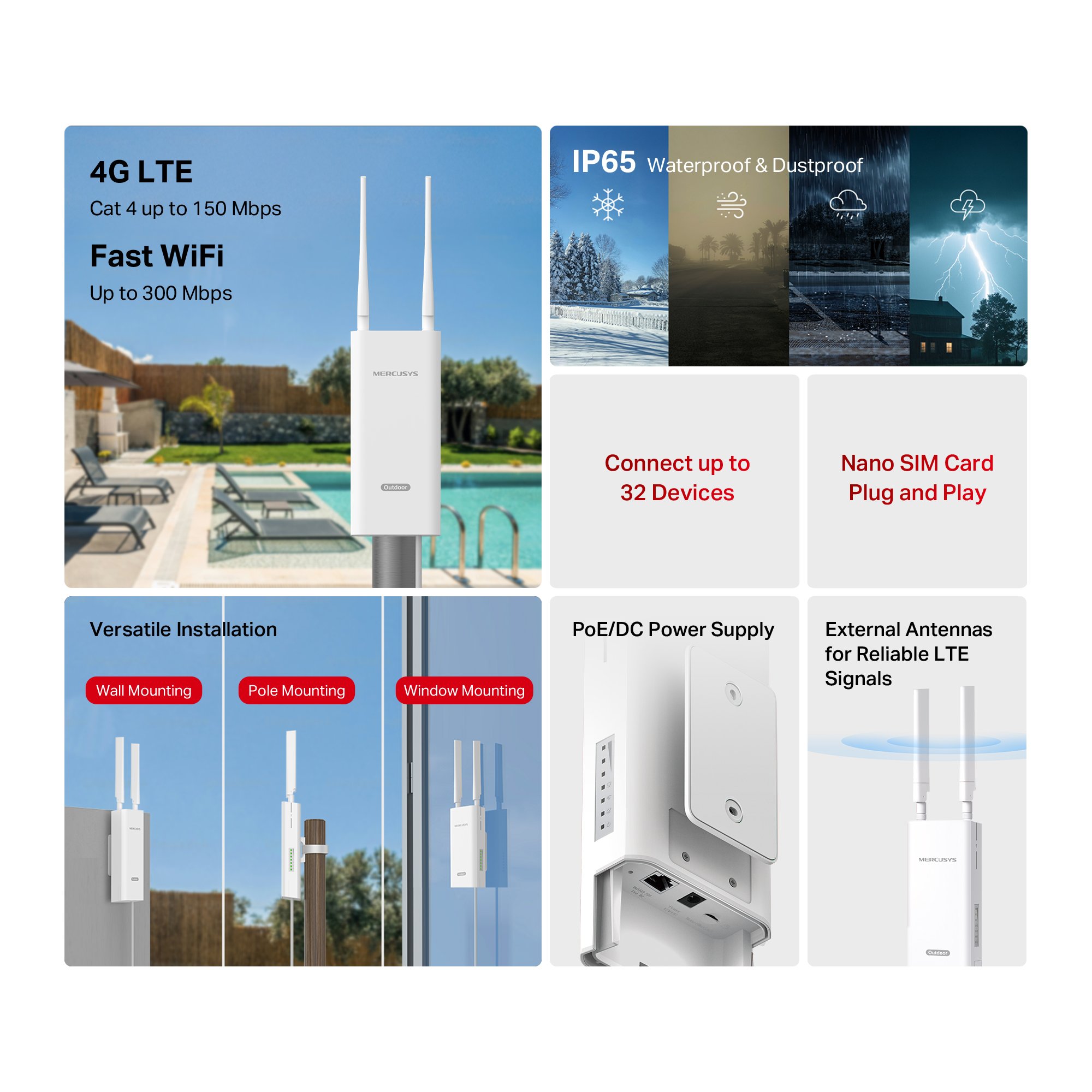 Venkovní/vnitřní Wi‑Fi router Mercusys MB118‑4G podporou 4G LTE je určen hlavně do míst, kde není dostupné pevné připojení nebo je potřeba spolehlivá bezdrátová síť s možností připojit více zařízení najednou. Díky kombinaci mobilní 4G LTE konektivity, rychlé Wi‑Fi sítě a pevné konstrukce s ochranou proti povětrnostním vlivům nabízí MB118‑4G flexibilní řešení připojení pro různé typy prostředí.
