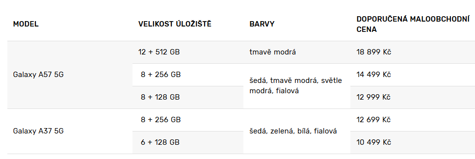 Oba telefony budou dostupné v několika atraktivních barevných variantách. U modelu Galaxy A57 5G jde o šedou, tmavě modrou, světle modrou a fialovou, v případě varianty Galaxy A37 5G se bude možné rozhodovat mezi šedou, zelenou, bílou nebo fialovou barvou.
