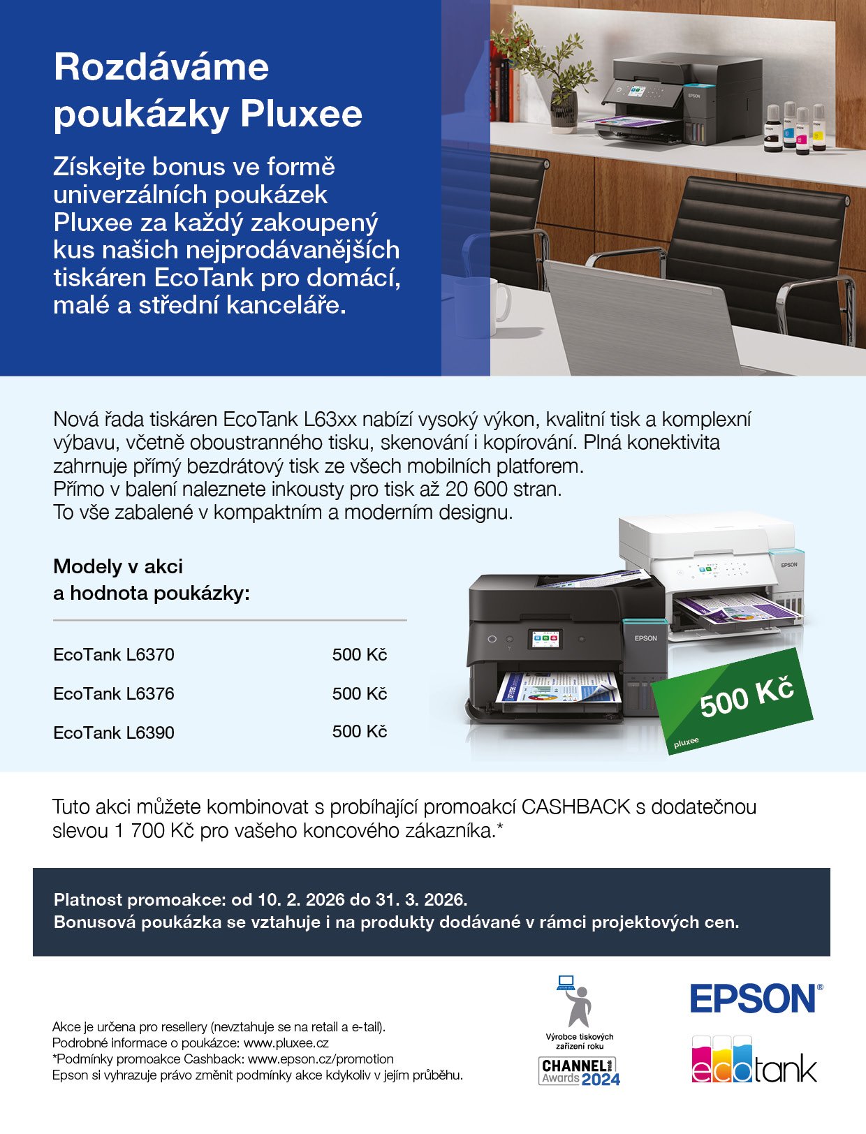 | Anotace | Získejte bonus ve formě univerzálních poukázek Pluxee za každý zakoupený kus našich nejprodávanějších tiskáren EcoTank pro domácí, malé a střední kanceláře. Platnost promoakce: od 10. 2. 2026 do 31. 3. 2026. |