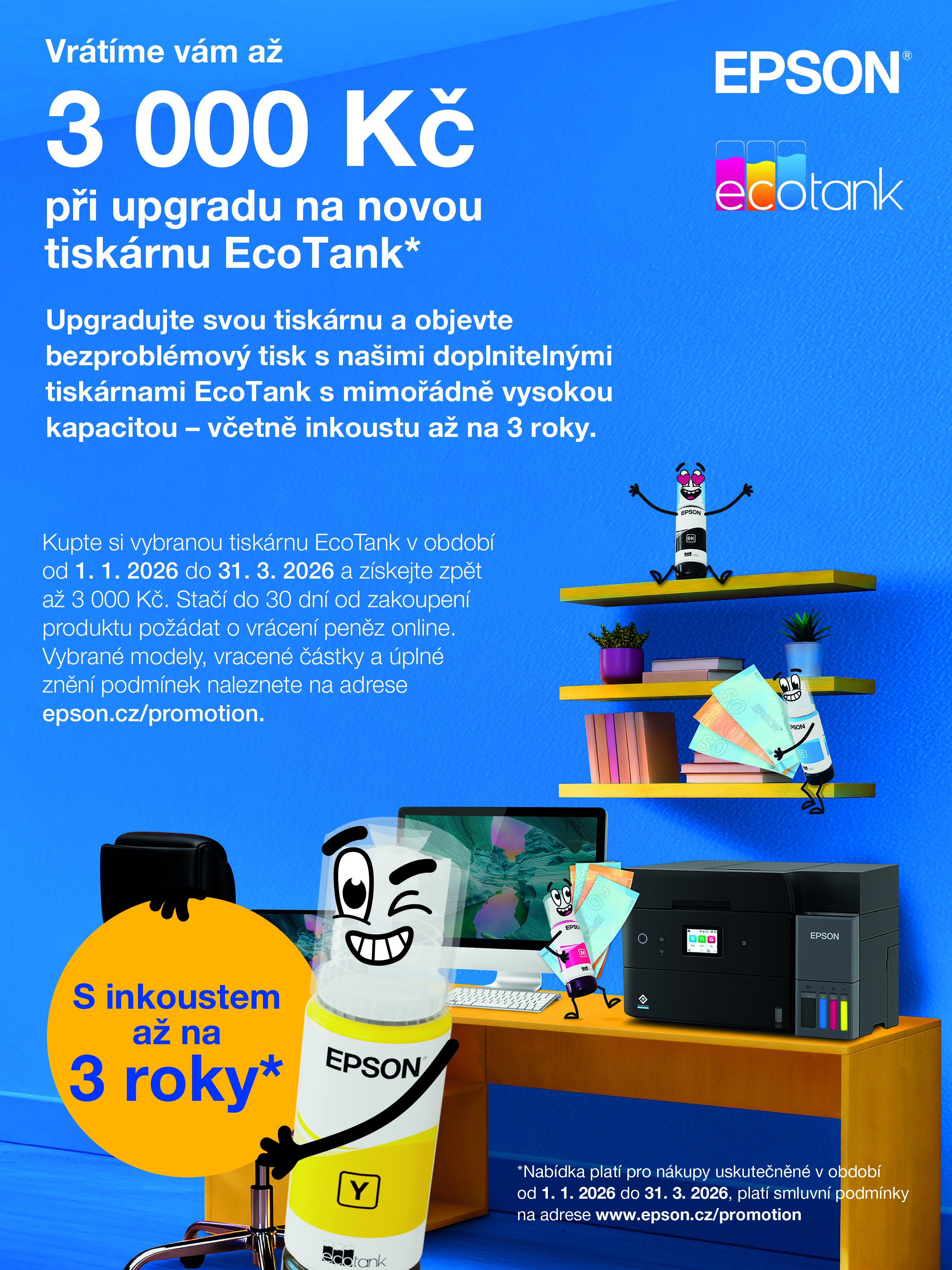 | Anotace | Kupte si vybranou tiskárnu EcoTank v období od 1. 1. 2026 do 31. 3. 2026 a získejte zpět až 3 000 Kč. Podrobné informace a smluvní podmínky na adrese www.epson.cz/promotion. |