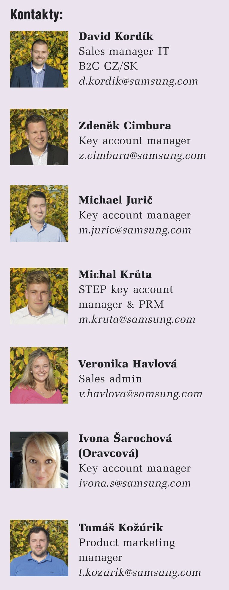V polovině srpna se k nám připojil Michal Krůta, a to na pozici key account managera pro SMB kanál, kde Samsung ke komunikaci s kanálem využívá partnerský program STEP. Jeho prostřednictvím sdílíme informace o akcích, novinkách a mimo jiné dokážeme partnery informovat o aktuálním společném obratu. Na Slovensku je naší dlouhodobou oporou Ivona Šarochová (Oravcová). Ivona má na starosti prodej na celém Slovensku, což samozřejmě není jednoduché, ale ona to bravurně zvládá.