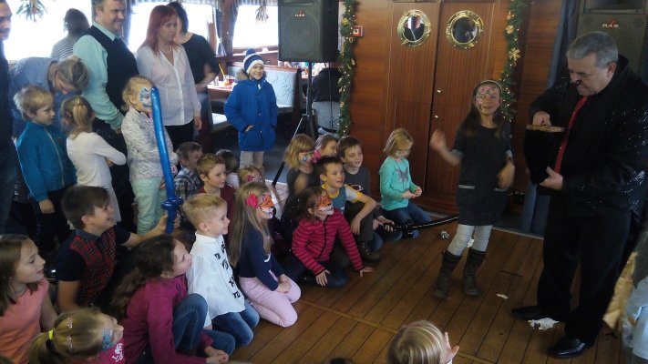 To už se ale rozezněly první tóny kapely Elitte Music, spustila se řízená degustace předního čejkovického vinaře, u karikaturistů se tvořily fronty a zábava se rozjela v plném proudu. Na své si přišli jak dospělí, tak především děti. Pro ně byl totiž připraven zábavný animační program v celé spodní kryté palubě, kde na ně čekal klaun a kouzelník Roberto se svým tradičním vystoupením. Děti tancovaly na dětskou diskotéku, s animátorkou vyráběly zvířátka a vánoční ozdoby, které si pak odnesly domů. Nechybělo ani malování na obličej. Ve druhé polovině plavby přišel Ježíšek a pro každé dítě nechal pod vánočním stromečkem dáreček.