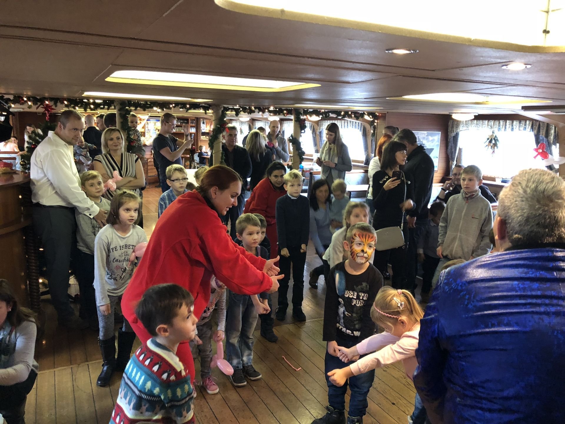 To už se však rozezněly tóny kapely Elitte Music, spustila se řízená degustace předního čejkovického vinaře, u karikaturisty se tvořily fronty a zábava se rozjela v plném proudu. Na své si přišli jak dospělí, tak především děti. Pro ně byl totiž připraven zábavný animační program v celé spodní kryté palubě, kde na ně čekal klaun a kouzelník Roberto se svým tradičním vystoupením. Děti tancovaly na dětskou diskotéku, s animátorkou vyráběly zvířátka a vánoční ozdoby, které si pak odnesly domů. Nechybělo ani malování na obličej. Ve druhé polovině plavby přišel Ježíšek a každé dítě dostalo vánoční dáreček.
