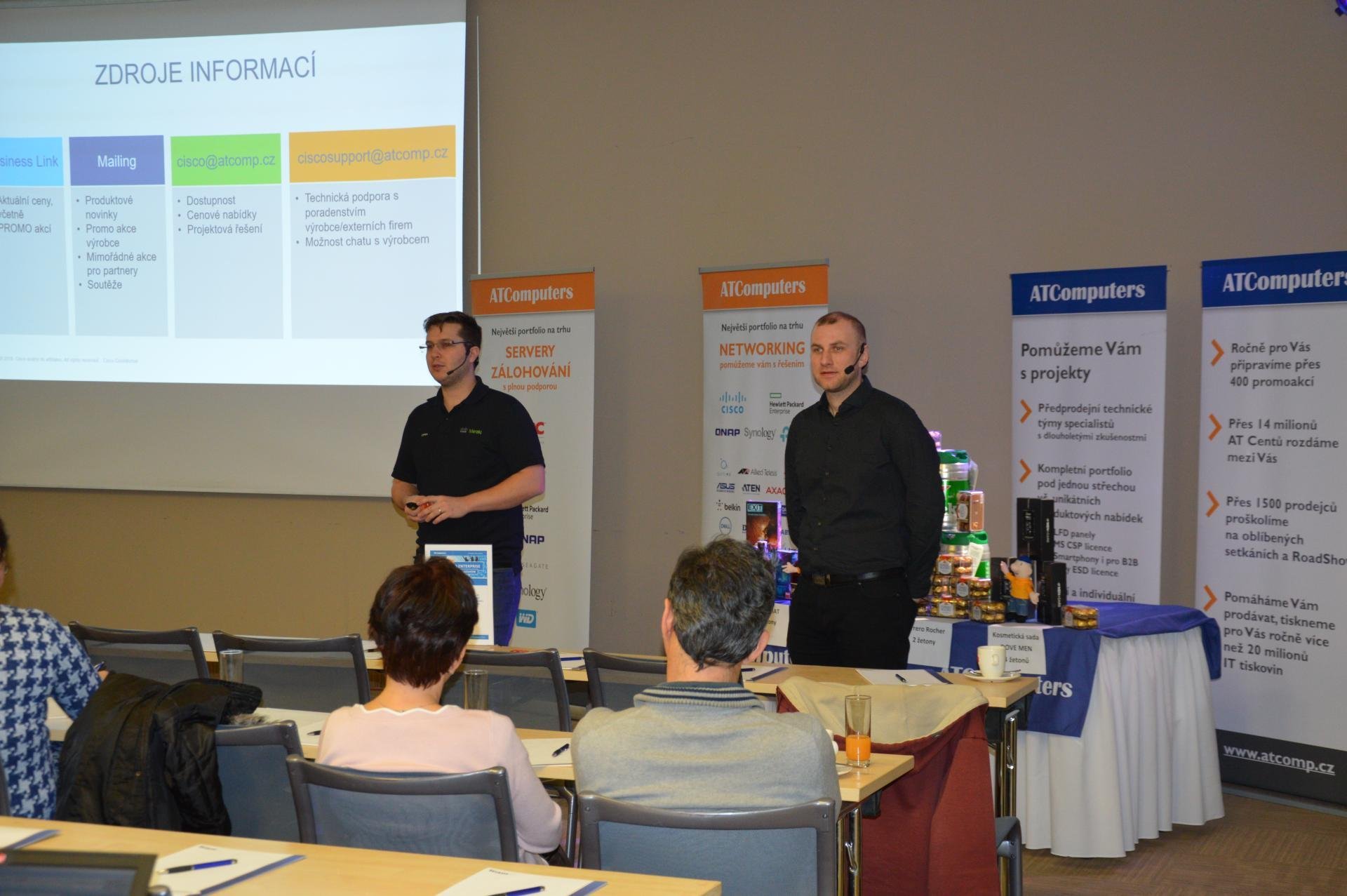 Jan Krška a Michal Gebauer resellery seznámili s aktualitami z dílen společnosti Cisco a přinesli hned několik důvodů, proč tuto značku prodávat, a jaké nástroje k tomu mají nejen u ATC k dispozici. Nechyběl ani návod, jak se stát Cisco partnerem a získat tak řadu výhod. Přítomní se dále například dozvěděli, že velký důraz je aktuálně kladen na tzv. collaboration nástroje, zahrnující zejména IP telefonii a Webex Teams. Značná pozornost byla samozřejmě věnována i SMB switchům, routerům a Wi-Fi technologiím.