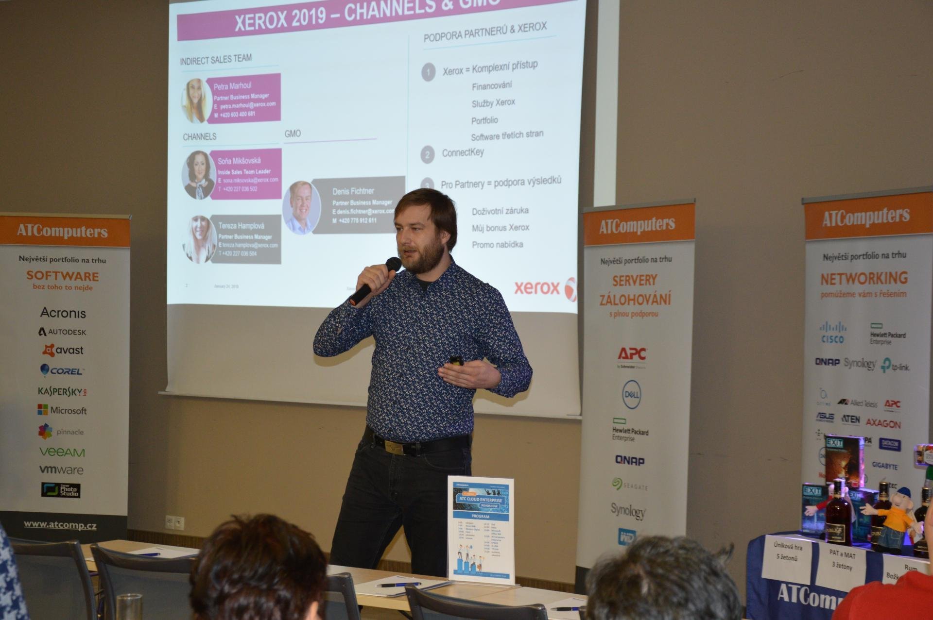 Pražskou zastávku po uvítání od Martina Wankeho, marketingového ředitele AT Computers, odstartoval Xerox zastoupený Tomášem Zimánim. Po krátkém představení společnosti jako takové dostalo prostor představení týmu starajícího se o partnerský prodej v ČR a následně došlo k představení klíčových benefitů, na kterých mohou partneři Xeroxu „stavět“. Zmínit můžeme komplexní přístup (financování, služby, portfolio a spolupráce se softwary třetích stran), platformu ConnectKey nebo partnerský program, promoakce či systém Můj bonus Xerox. Ve zbylém čase prezentace proběhlo detailní představení nových tiskáren a multifunkcí, ale i novinek z oblasti produkčního tisku nebo spotřebního materiálu. Stále důležitější roli hrají také služby poskytované v oblasti digitalizace, automatizace a archivace dat. Za velkou výhodu Xerox považuje také možnost podporované modely rozšiřovat o nové aplikace, podobně jako např. u chytrých telefonů.