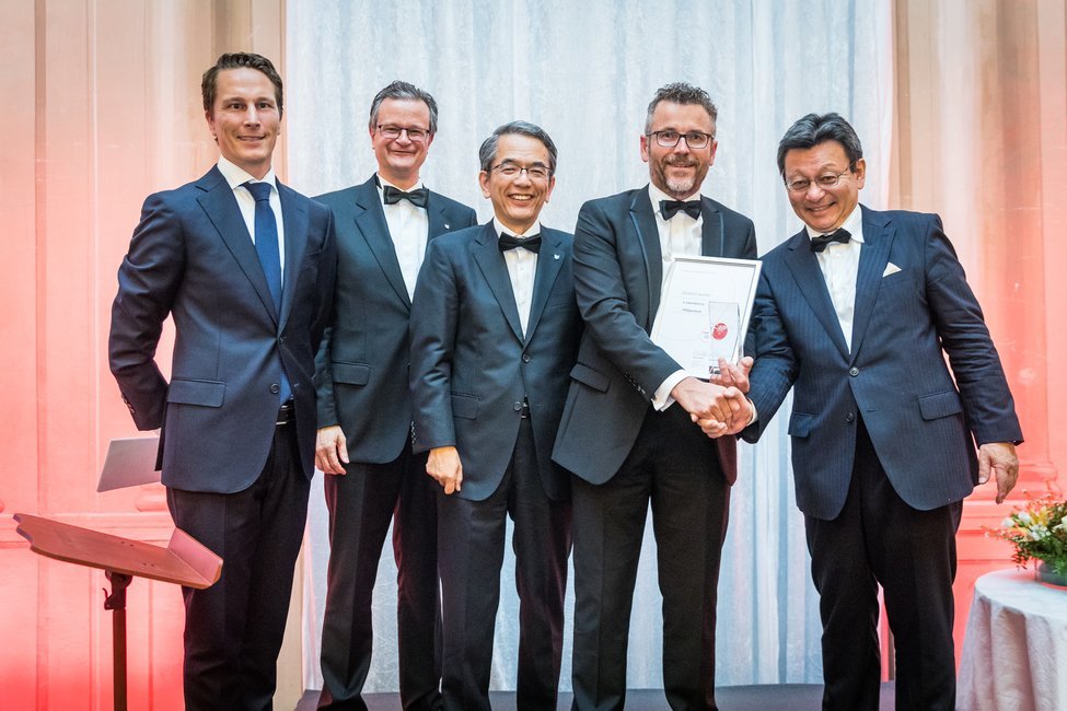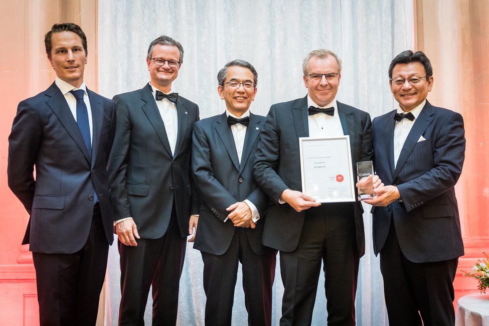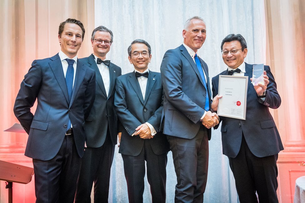 Ocenění zástupcům společností (na fotografiích vždy druhý zprava) předával Yoshinori Ikeda, deputy chief executive of office imaging products group společnosti Canon (první zprava). Zleva jsou na fotografiích Fabian van Hoegee, sales & marketing excellence director ve společnosti Canon a Markus Naegeli, executive vicepresident v Canonu.