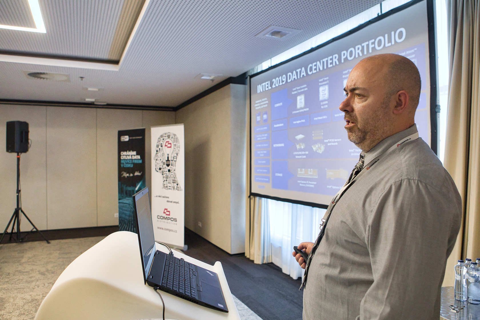 Karlu Štamberovi patřila i další přednáška, jejímž hlavním tématem byly novinky u Intelu, zejména v DC portfoliu. Řeč byla proto o nových Xeonech druhé generace a o storagích, které se v současné době díky vývoji Optanu rychlostně dostávají na úroveň operačních pamětí. Blíže byla představena hybridní Optane H10 NVMe SSD, která kombinuje SSD technologii - „4bit per cell“ paměť a vysokorychlostní 3D Xpoint technologii. Výsledek této kombinace se přitom vejde do jednostranného M.2 2280 form factoru. Poslední část přednášky patřila přehledu, co je nového v networkingovém portfoliu Intelu.