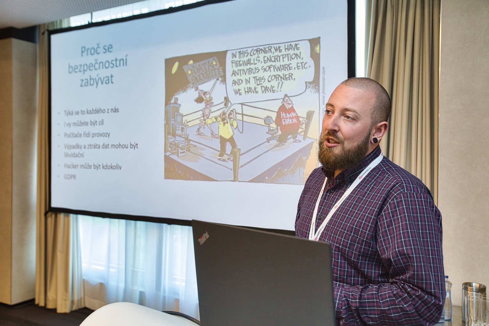 Po přestávce se před posluchače postavil za Eset Pavel Matějíček, který hovořil o tom, proč je dnes nutné věnovat se bezpečnosti. Zdůraznil, že za 80 % úniků dat mohou kompromitovaná hesla. Ta ohrožuje například stále častější phishing, keyloggery, otevřené Wi-Fi sítě, ale i opakovaná využívání stejných přihlašovacích údajů u soukromých i pracovních účtů. Matějíček se proto věnoval i tomu, proč jsou politiky časté změny hesla neefektivní, a jak vytvořit bezpečné heslo – podle Esetu je například mnohem bezpečnější tzv. „fráze“ oproti nesmyslné kombinace znaků. Dalším způsobem, jak se účinně chránit je podle Matějíčka vedle dvoufaktorové autentizace šifrování včetně FDE (full disc encryption). To vše samozřejmě rámovalo představení možností řešení Eset Encryption Enterprise Server a navazujícího Eset Encryption Go, který nevyžaduje klientskou aplikaci. Matějíček se dotkl také tématu kyber-vyděračů a připomněl, že jednou z nejdůležitějších zásad bezpečnosti v kyberprostoru je řádné zálohování a univerzální zásada 3-2-1 (tři zálohy, na dvou médiích, jedna záloha geograficky oddělená).