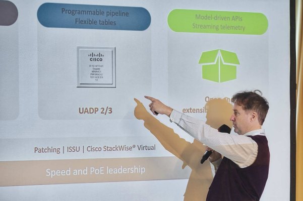 Následující přednáška se točila okolo nových switchů Cisco Catalyst 9 000, které představil jako základ pro inteligentní sítě Jaroslav Zmatlík. Rodinu Catalyst 9 000 rozdělil na produkty vhodné jako vstupní přepínače (9 200, 9 300, 9 400) a ty určené pro páteřní switching (9 500, 9 600). Zmatlík uvedl, že produkty řady Catalyst 9 000 jsou postaveny tak, aby vyhovovaly novým požadavkům digitální éry od mobility přes cloud až po internet věcí. Nabízejí bezkonkurenční programovatelnost, výkon, bezpečnost i možnosti externích úložišť, jako SATA SSD nebo USB 3.0, a to pro lokální logging, hostování aplikací třetích stran i kontejnery.