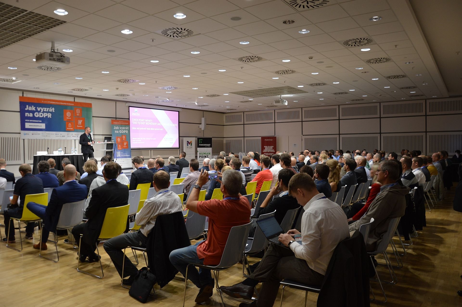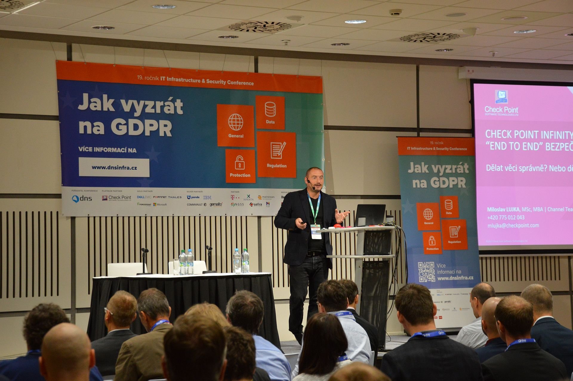 Následně se již rozběhla série prezentací a workshopů jednotlivých partnerských společností. Miroslav Lujka ze společnosti Check Point se zabýval bezpečností koncových bodů, představením řešení společnosti Check Point a kde se v souvislosti s GDPR uplatní a také otázkou, zda „Dělat věci správně nebo dělat správné věci?“. Miroslav Lujka připomenul i několik známých incidentů s úniky dat a zamyslel se, jak k tomu může dojít (malware, ztráta či krádež zařízení, Dos či DDos útok nebo například zneužití identity) a jaké to může mít důsledky (finanční ztráty, poškození důvěry, narušení provozu nebo pokuty).