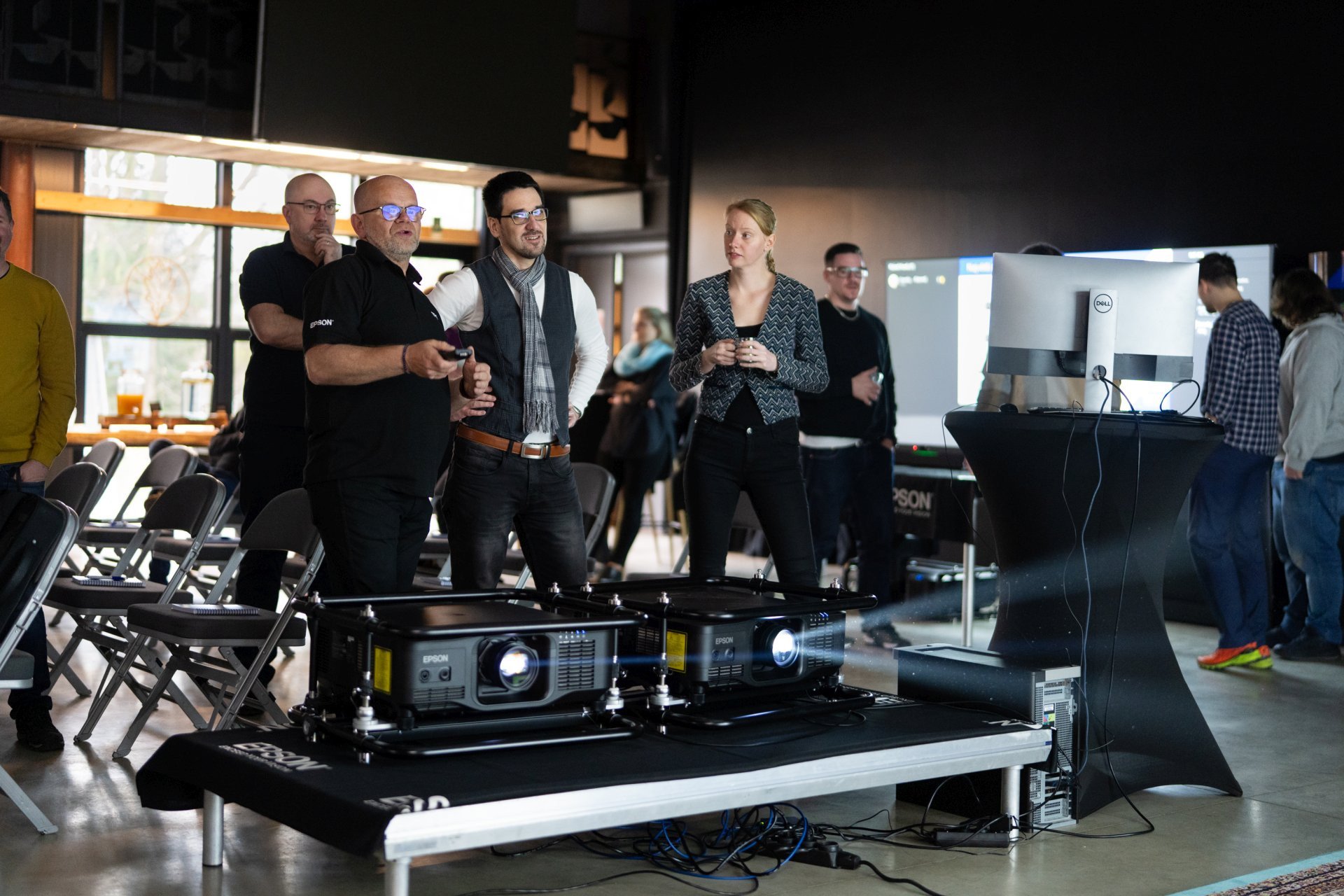 Druhá část setkání byla věnována praktickým ukázkám. Návštěvníci měli prostor vyzkoušet si možnosti instalačních projektorů řady EPSON PU s důrazem na automatizovaný blending a stacking více projektorů včetně zakřivené plochy a další užitečné funkce při práci s větším množstvím projektorů zároveň.