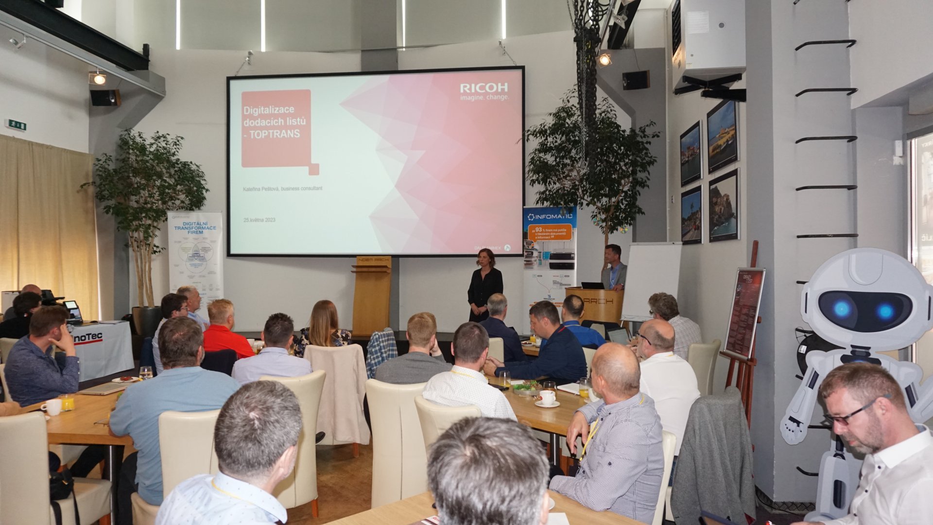 Kateřina Peštová, business konzultantka společnosti Ricoh, účastníkům konference představila přínosy digitalizace dodacích listů ve společnosti TOPTRANS. Posluchače nejprve seznámila s výchozí situací v podniku a potřebami a požadavky, které bylo potřeba řešit. Následně vysvětlila postup při návrhu nového řešení a své vystoupení uzavřela nastíněním výsledného stavu a přínosů řešení, které bylo postaveno na skeneru Ricoh 7300NX a platformě MetaServer.