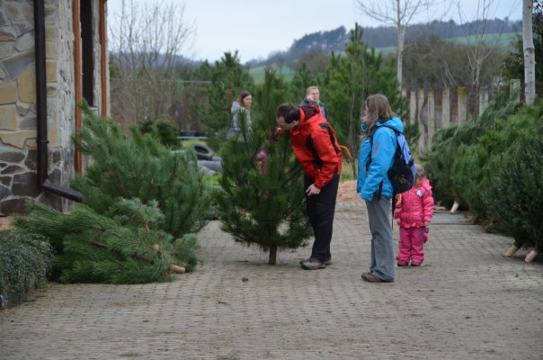 Mezitím všichni po očku pokukovali po svých „pichlavých“ favoritech. A že bylo z čeho vybírat. K dispozici byly tři druhy jedlí, dva druhy borovic a dva druhy smrků a všechny byly v obložení. Někteří si vybraný strom umístili na tajné místo, aby jim ho náhodou někdo jiný nevyfoukl, než se vrátí z procházky ze stromové plantáže.