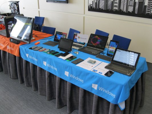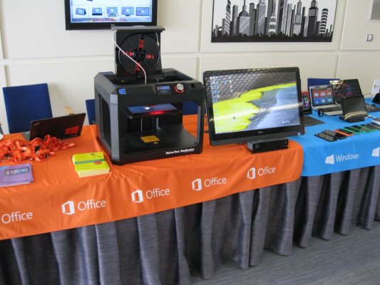 Před hlavním sálem byla navíc k dispozici zvědavějším účastníkům i produktová výstavka s počítači a smartphony s nejnovějším buildem Windows 10 nebo také možnost se pomocí Kinectu nechat naskenovat a vytisknout si bustu na 3D tiskárně pomocí programu Microsoft Build.