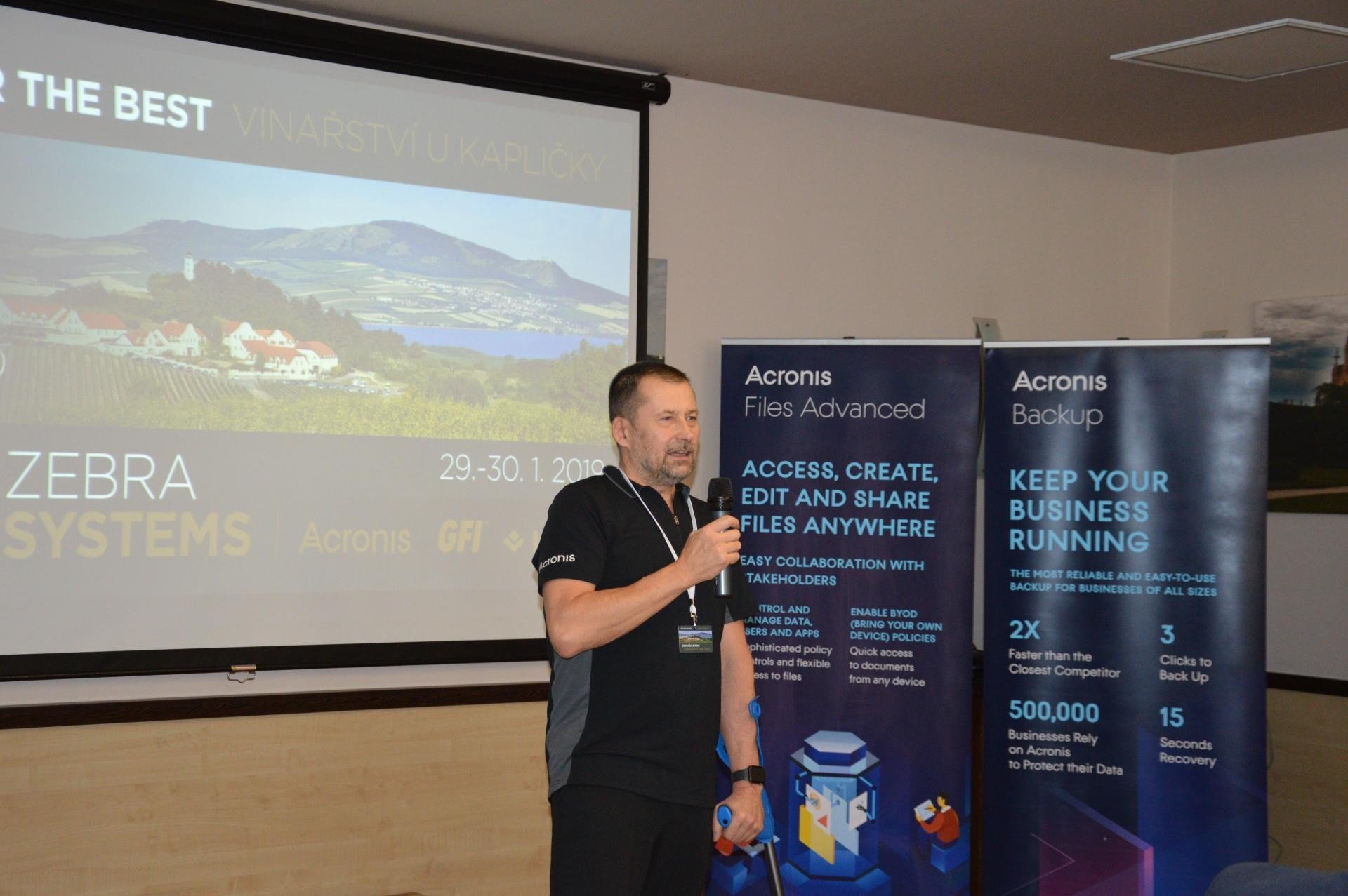 Distribuční společnost Zebra systems se rozhodla pro obměnu svého tradičního schématu distribučních setkání značek Acronis a GFI (+ Kerio), které běžně probíhalo separátně, a pro tentokrát pozvalo do Vinařství U Kapličky v Zaječí vybrané partnery všech tří značek současně. Při této příležitosti byli také vyhlášení nejlepší partneři za uplynulý rok.