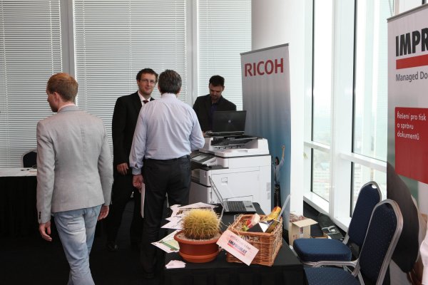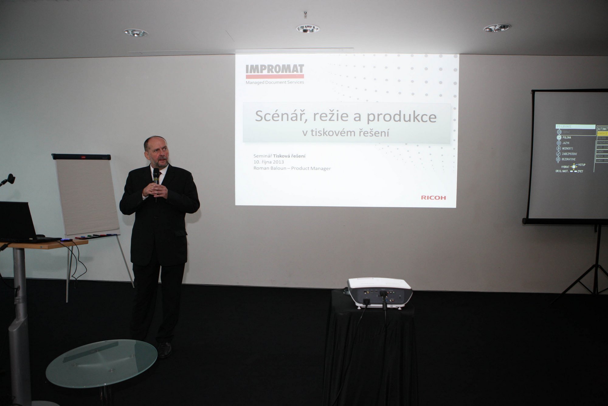 Roman Baloun ze společnosti Impromat představil v úvodní přednášce produktovou nabídku Ricoh, včetně méně obvyklých tiskových strojů s gelovými inkousty pro tisk letáků a velkoformátových tiskáren pro použití v technické oblasti. V dalším výkladu se zaměřil na tiskové služby, včetně digitalizace dokumentů, doplněných o příklady z praxe.