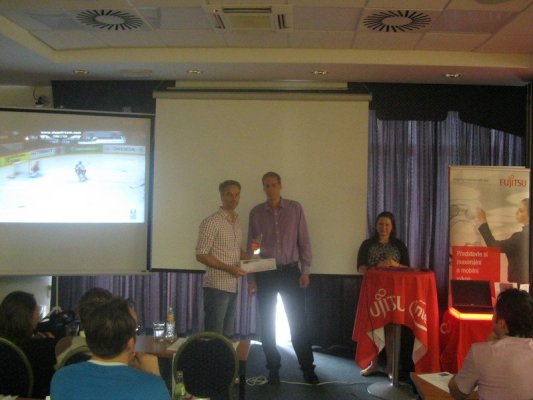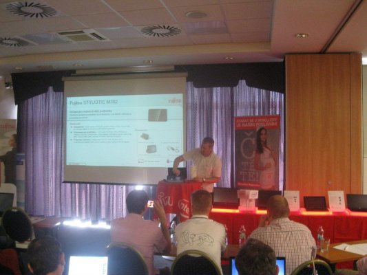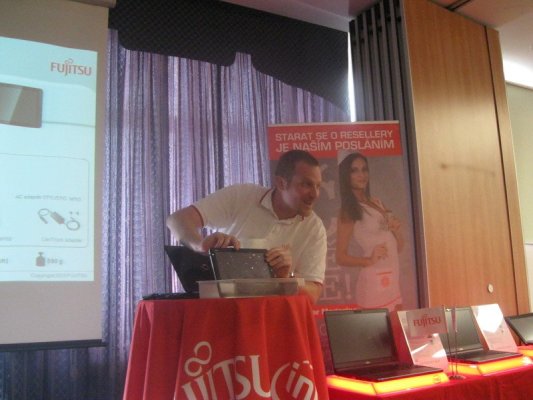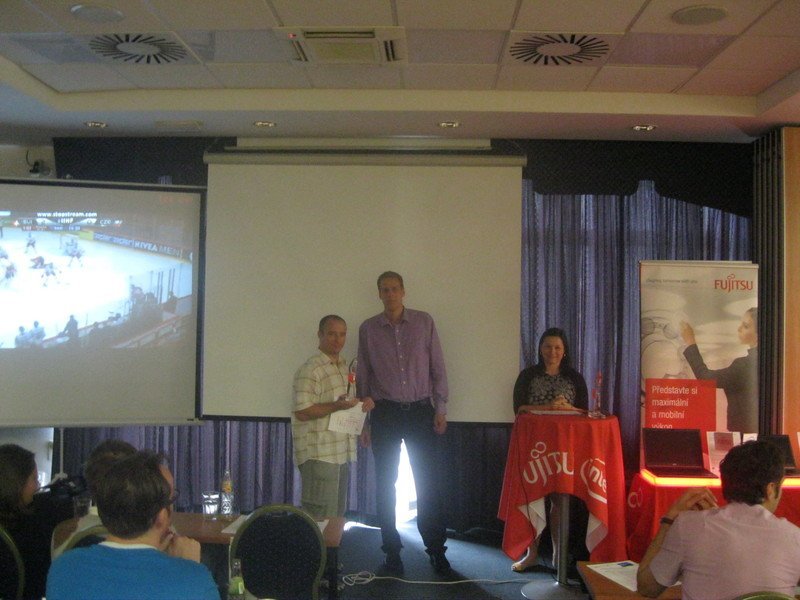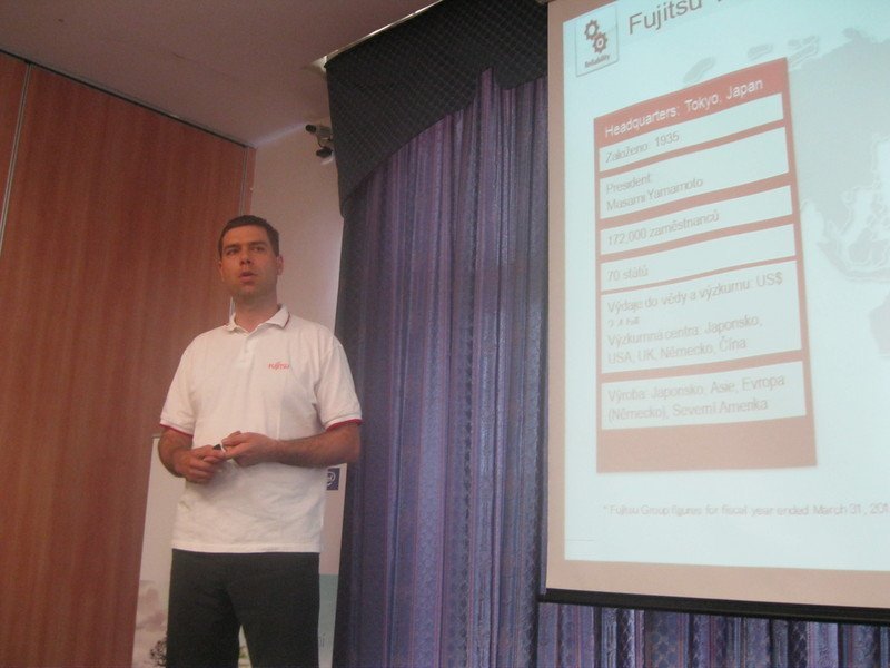 Odpolední přednáškový program naplno využili Stanislav Novák s přednáškou na téma Palm Secure a Jan Šplíchal s Robertem Benešem, kteří představili novinky v produktovém portfoliu Fujitsu, včetně praktických ukázek a koupání vodě odolného tabletu. O servisech a službách pohovořil Jiří Charbuský.