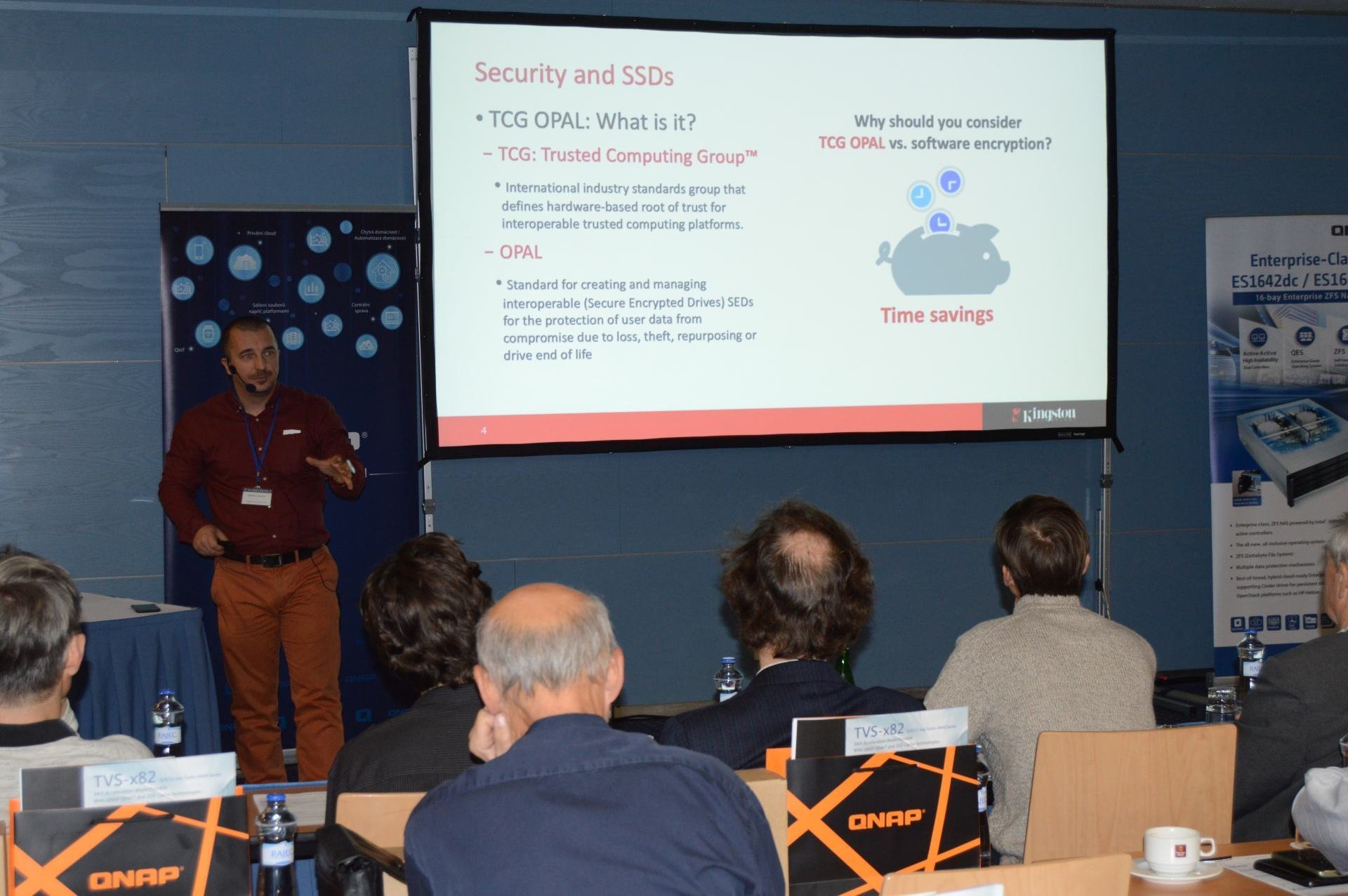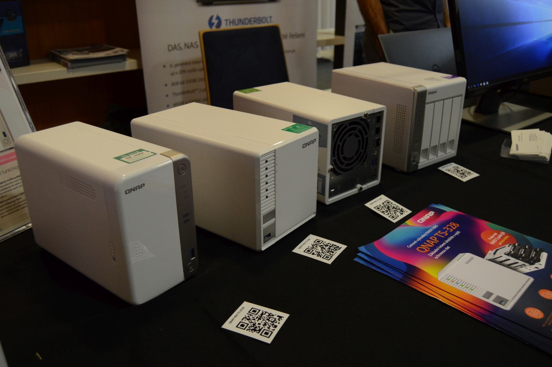 Celým dnem příchozí provázel Karel Kapinus. První přednášky se chopil zástupce pořádající společnosti QNAP Václav Štajner, který se ve své prezentaci zaměřil především na představení jednotlivých NAS od QNAPu. Mezi nejzajímavější produkty se řadí například řada Ryzen NAS, která vyniká především díky zakomponovanému procesoru AMD Ryzen, díky němuž jsou NASky mnohem výkonnější. QNAP samozřejmě myslí i na „jablíčkáře“, a proto vybavil některá zařízení konektorem Thunderbolt 3. Za zmínku stojí také NAS poskytující tři sloty pro disky, což je poměrně netradiční (NAS mívají dva a čtyři sloty). Zde se řadí TS-328 nebo TS-332X. Mimo to byla řeč také o upgradovaném operačním systému QTS 4.3.5, který nyní umožňuje SSD overprovisioning, díky kterému se prodlouží životnost SSD. Druhé přednášky se chopil Marek Řihošek ze společnosti Seagate, který se ve své prezentaci zaměřil čistě na disky Ironwolf a Ironwolf Pro určené pro NAS. Představil zde také Health management system schopnou zavčasu varovat před zhoršujícím se stavem disku, nebo službu Recovery zajišťující obnovu dat z nefunkčních disků.