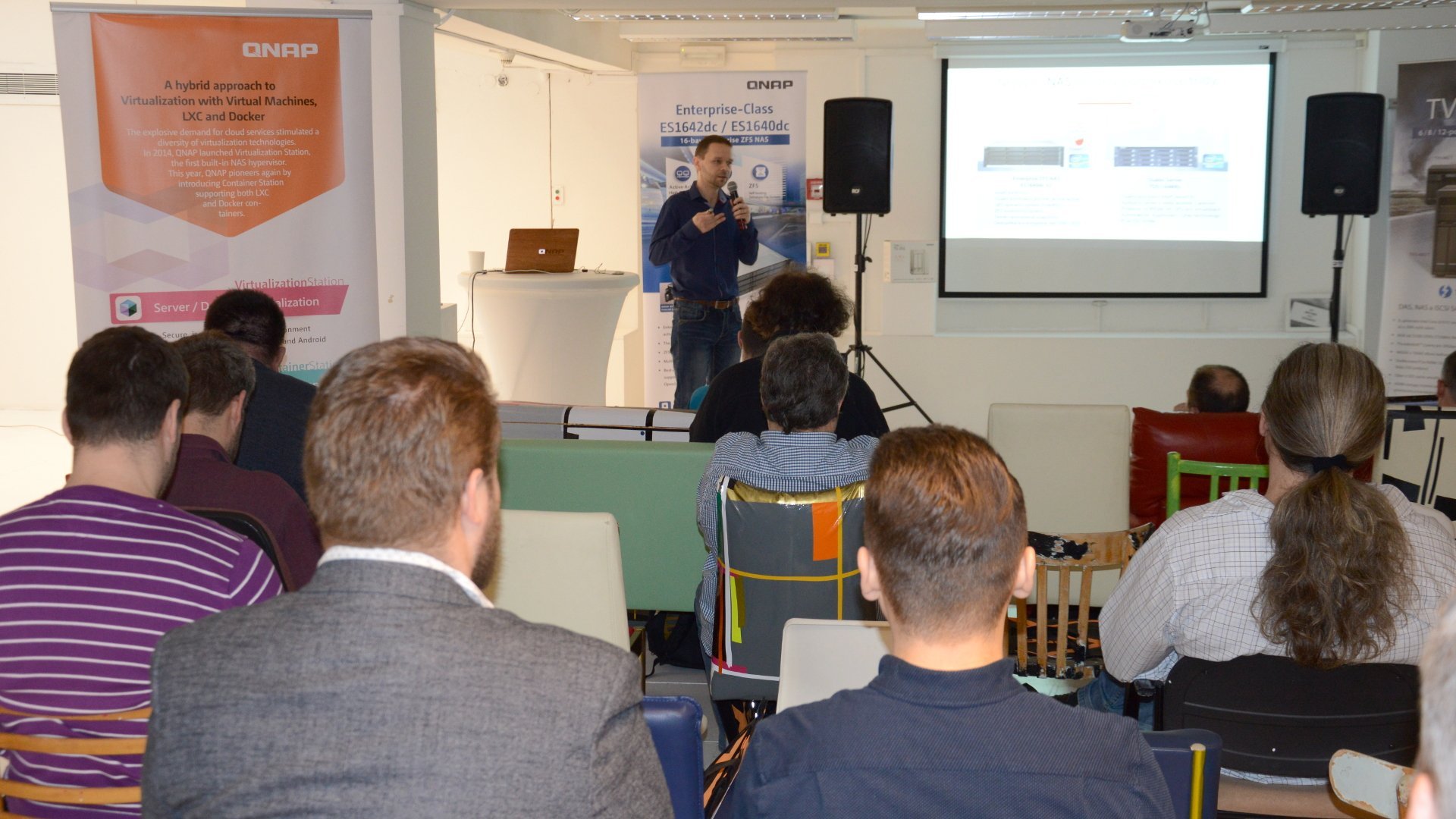 Jako první vystoupil Václav Štajner, business development manažer QNAPu, který společnost uvedl a představil široký okruh oblastí, ve kterých se NAS servery výrobce uplatňují. Dále partnery informoval, jaké programy mohou v rámci spolupráce využívat. Partneři se svými projekty se mohou obracet pro řešení projektové podpory na autorizované distributory. U reklamací s pokročilou výměnou pak zákazníci nemusí komunikovat přes prostředníka ve formě distributora a partnera, ale mohou jednat přímo se společností QNAP. Z benefitů zmínil Václav Štajner program NFR, jehož využití může partnerům zajistit výraznou slevu na nákup produktu, který bude testován nebo vystaven.