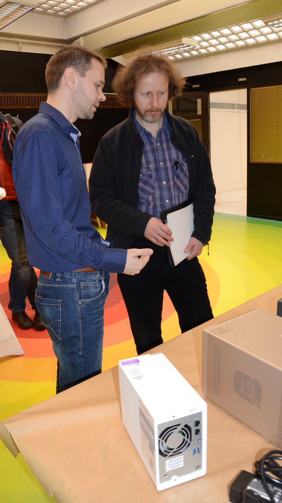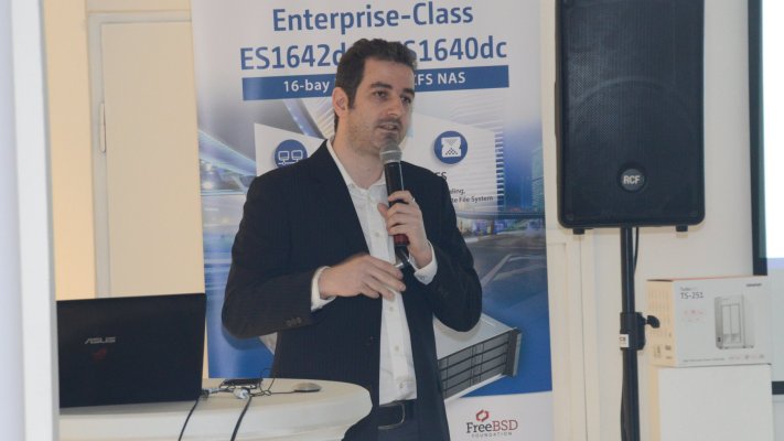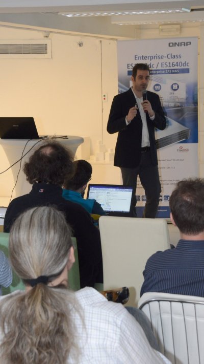 Druhou částí programu byla prezentace novinek z oblastí hardwaru i softwaru produktovým manažerem QNAPu Jeromem Jaussaudem. Velká část se týkala NAS určených pro firmy. Vyzdvižena byla řada TS-x53B opatřená čtečkou SD karet, porty USB-C a USB 3.0, PCIe sběrnicí a OLED s dotykovými tlačítky se zamezením proti vniknutí prachu. Oproti tomu model TVS-882BR disponuje Blu-ray mechanikou, která umožňuje záznam na BR disky. Ty poskytují mnohonásobně delší dobu uložení dat než pevné disky.