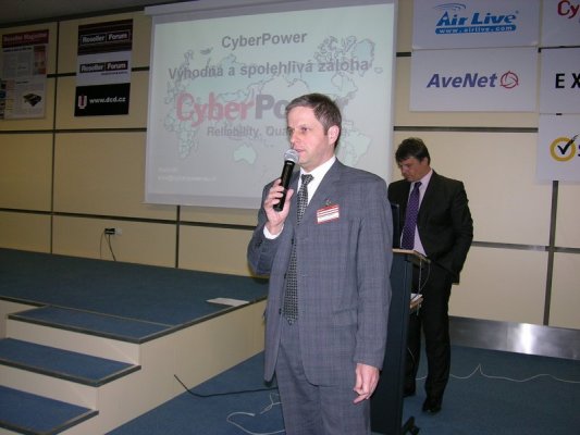 Potom zástupce CyberPower Systems Aleš Hill hovořil o nabídce této firmy i o jejích novinkách v oblasti zařízení pro zálohování napájení v letošním posledním čtvrtletí i o akcích na podporu prodeje koncem roku.