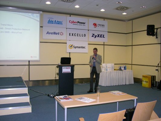 Po přestávce na občerstvení a případné konzultaci ze zástupci firem následovala velmi zajímavá přednáška Bezpečnost až na prvním místě aneb podniková bezpečnost jednoduše Petra Koudelky ze společnosti Zyxel. Představil možnosti podnikového zabezpečení (VPN, IDP, Antivir, Antispam, Content Filtering) včetně živé praktické ukázky nejdůležitějších funkcionalit. V případové studii předvedl propojení poboček firmy s centrálou pomocí VPN.