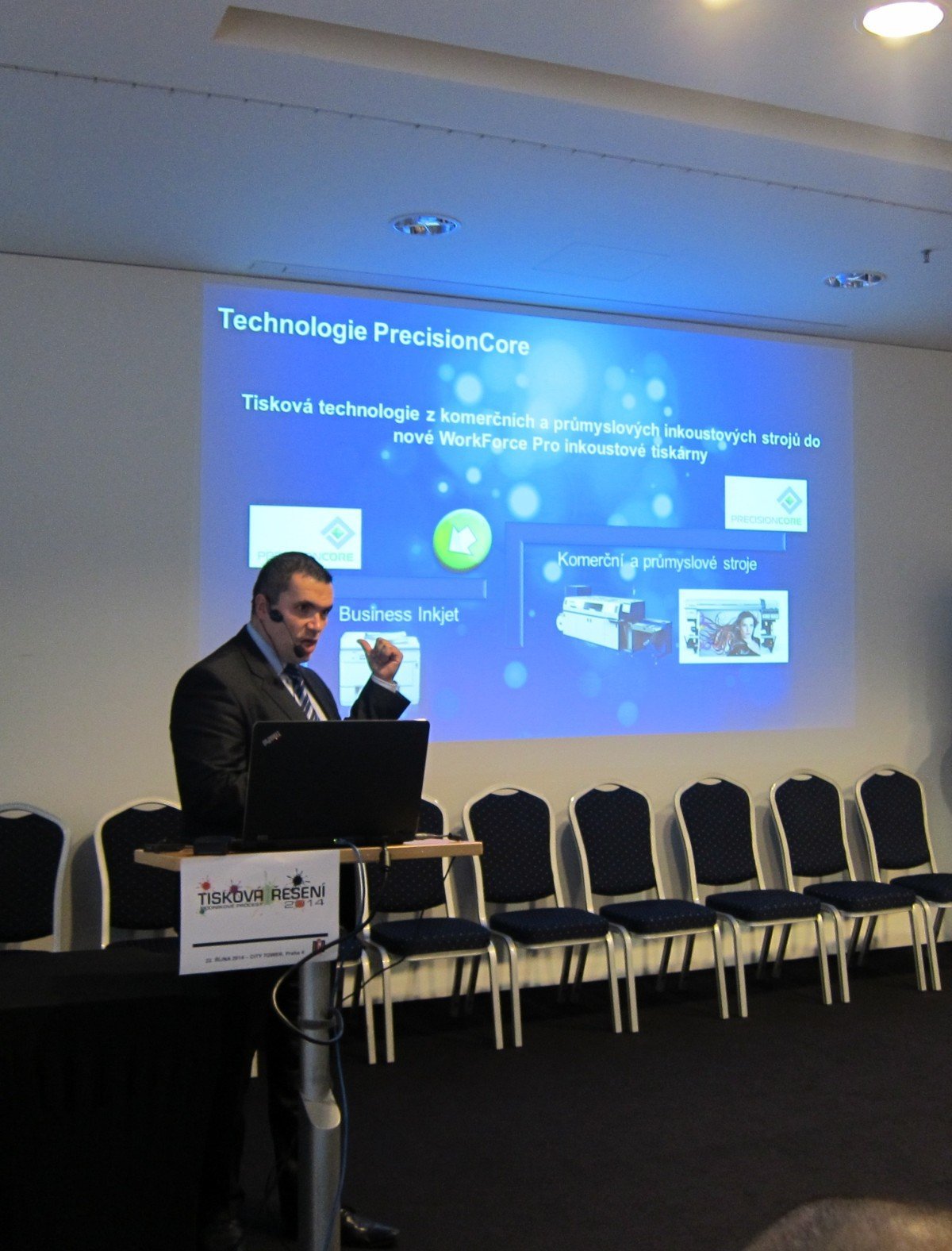 Zařízení řady WorkForce Pro a zejména pak přicházející řešení RIPS představil Marcel Divín ze společnosti Epson. Nové inkoustové tiskárny formátu A3 a A4 se zaměřují na úsporu tiskových nákladů, produktivitu tisku a minimální servisní požadavky. Zařízení jsou navíc vhodná pro nasazení v malých, středně velkých i velkých pracovních skupinách.