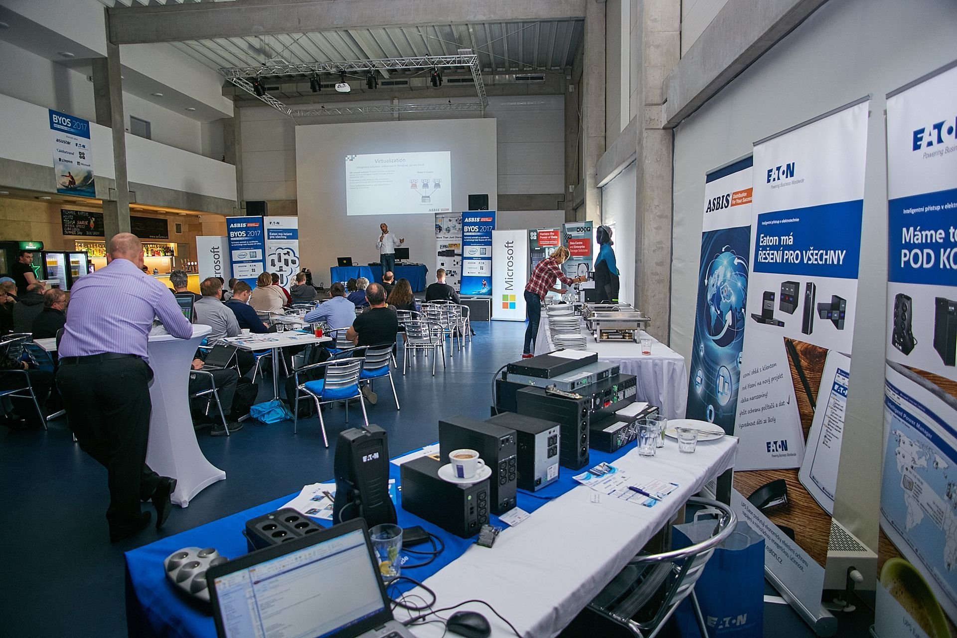 Za Eeaton na BYOSu hovořil Daniel Klein, který v úvodu představil společnost a neopomněl zdůraznit důležitost zálohování. Vysvětlil rozdíly mezi elektrickými zdrojovými agregáty a zdroji nepřerušeného napětí (UPS), přičemž výhody UPS spočívají zejména v okamžité záloze napájení, ochraně vůči problémům v síti a pokročilému monitoringu. Současné portfolio Eetonu nabízí širokou nabídku záložních zdrojů od malých 500VA UPS po velká 7,7MVA řešení. Produkty jsou rozděleny na UPS pro PC a pracovní stanice a domácí audio/video zařízení, pro síťová zařízení a servery a pro datová centra a budovy.