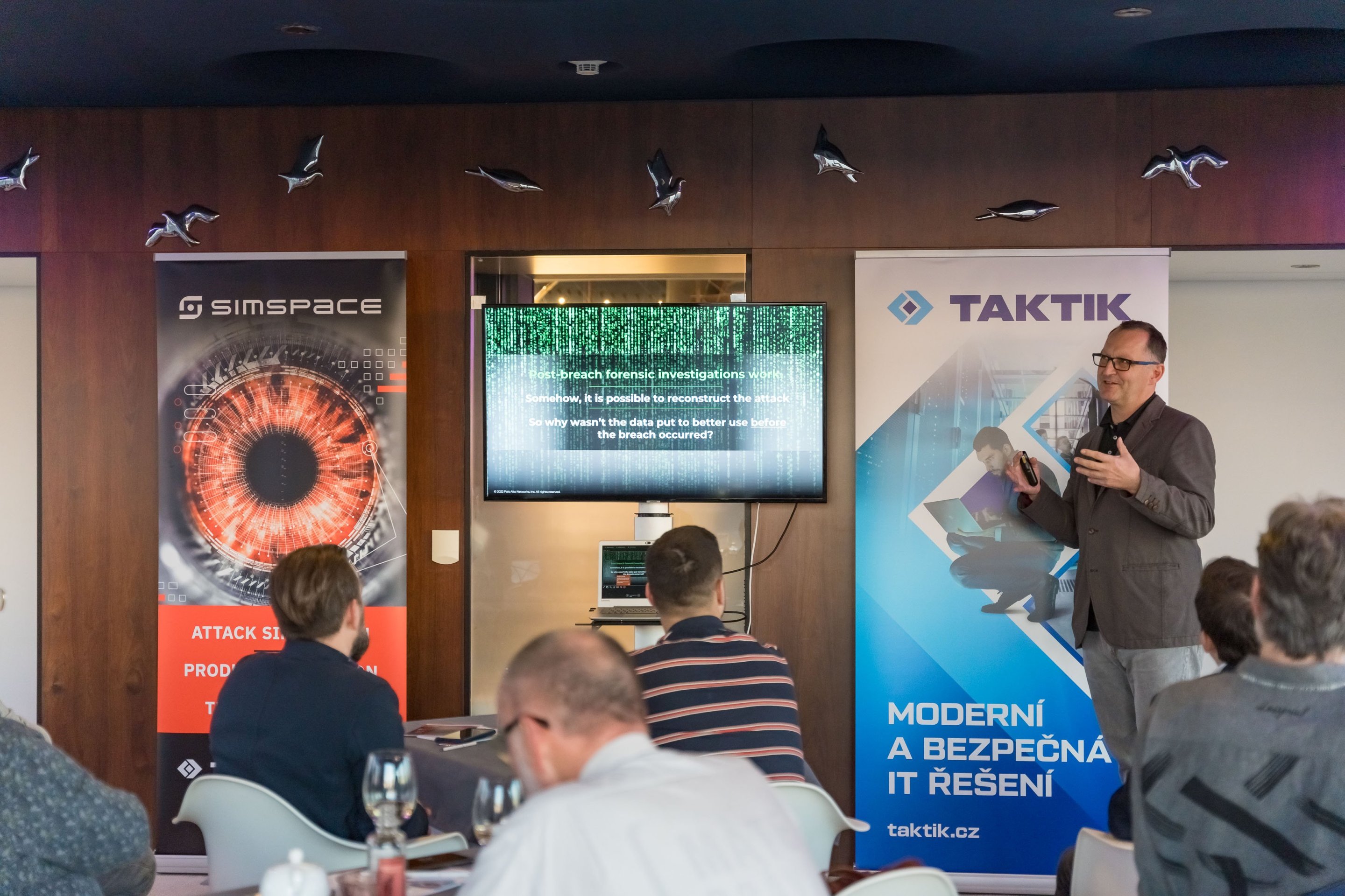 Účastníky přivítal CEO TAKTIKu Petr Belatka a představil firmu a její zástupce. Americkou společnost SimSpace a její bezpečnostní simulační nástroj, který je novým produktem v portfoliu TAKTIKu, představil ve své úvodní prezentaci Zdeněk Kopta. SimSpace je platforma pro zvýšení kybernetické bezpečnosti, jejíž základem je virtuální prostředí pro testování bezpečnostních scénářů. Pomocí nasimulovaného prostředí, naprosto věrně reprezentujícího produkční prostředí, lze vyzkoušet bezpečnostní incidenty, aniž by vlastní produkční prostředí bylo ohroženo.