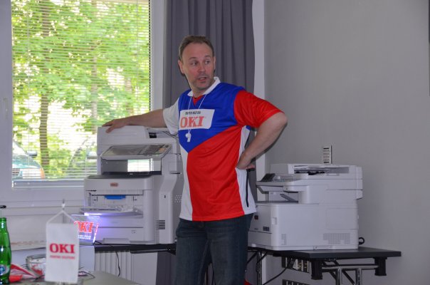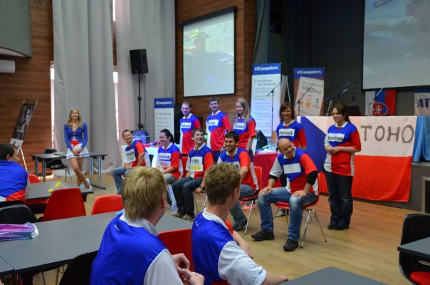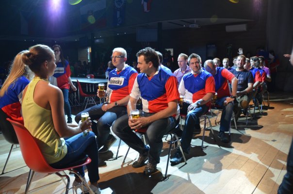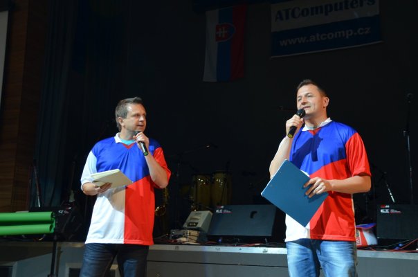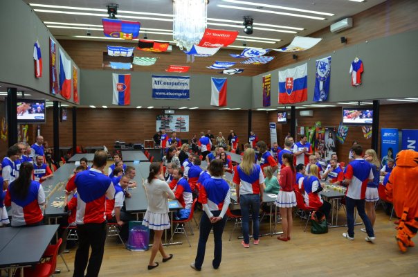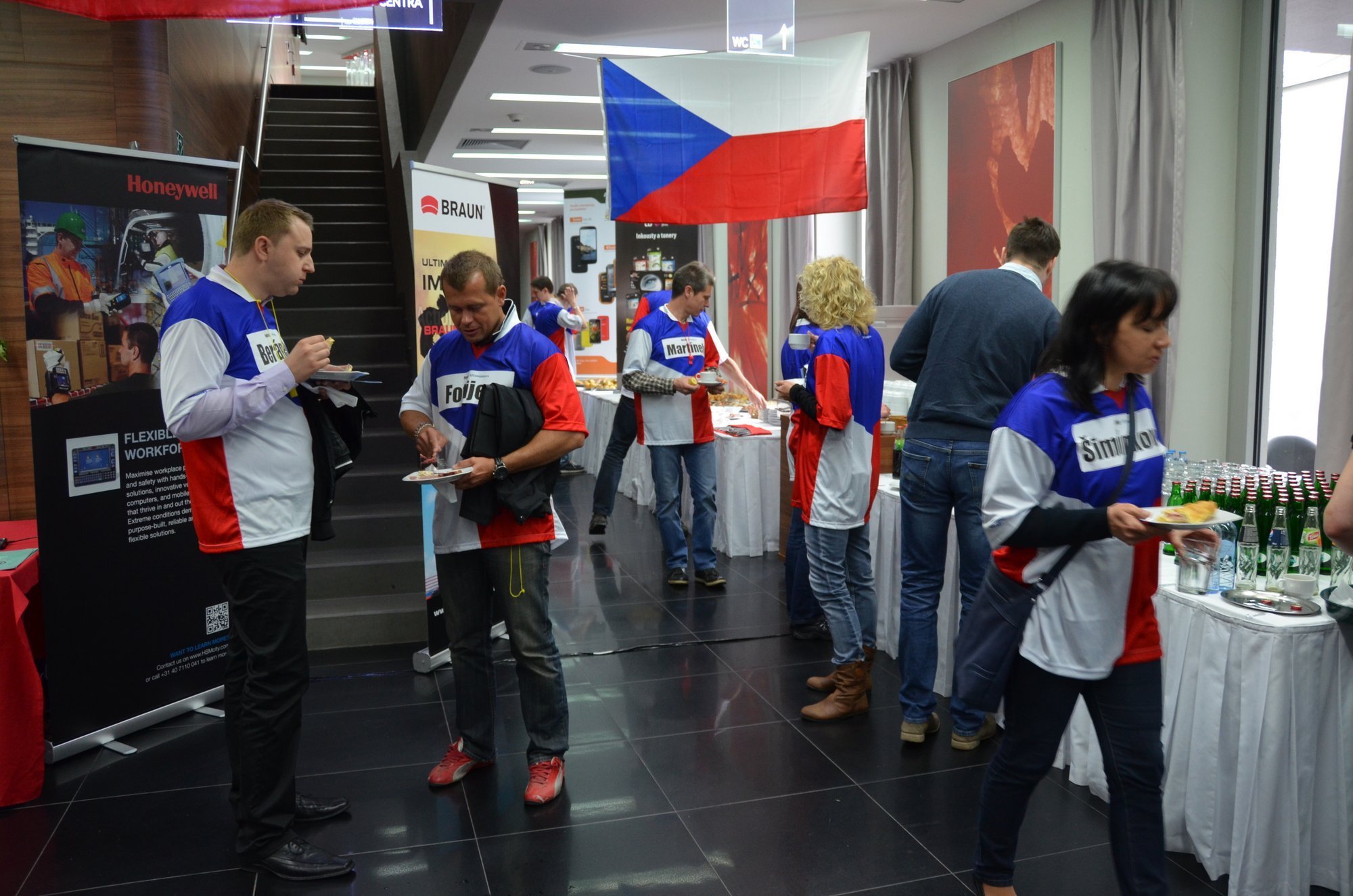 Už příjezd na akci byl netradiční, protože ještě než partneři stihli zaparkovat, již v sobě měli pro navození správné fanouškovské atmosféry záhřevný lektvar a zrcátka vozů ozdobená národními barvami – uvítání bylo již v lese :-). Poté, co si u recepce prošli slavobranou, utvořenou z roztleskávaček (MČR Tigers Cheerleaders VSK Univerzita Brno), dostali dres ve tvaru české/slovenské vlajky se svým jménem a barvou obdržené píšťalky byli rozděleni do týmů pro následné absolvování jednotlivých workshopů vedených zástupci výrobců. Umíte si představit 280 lidí pískajících na píšťalky a takřka všechny oděny do vlajky :-)?