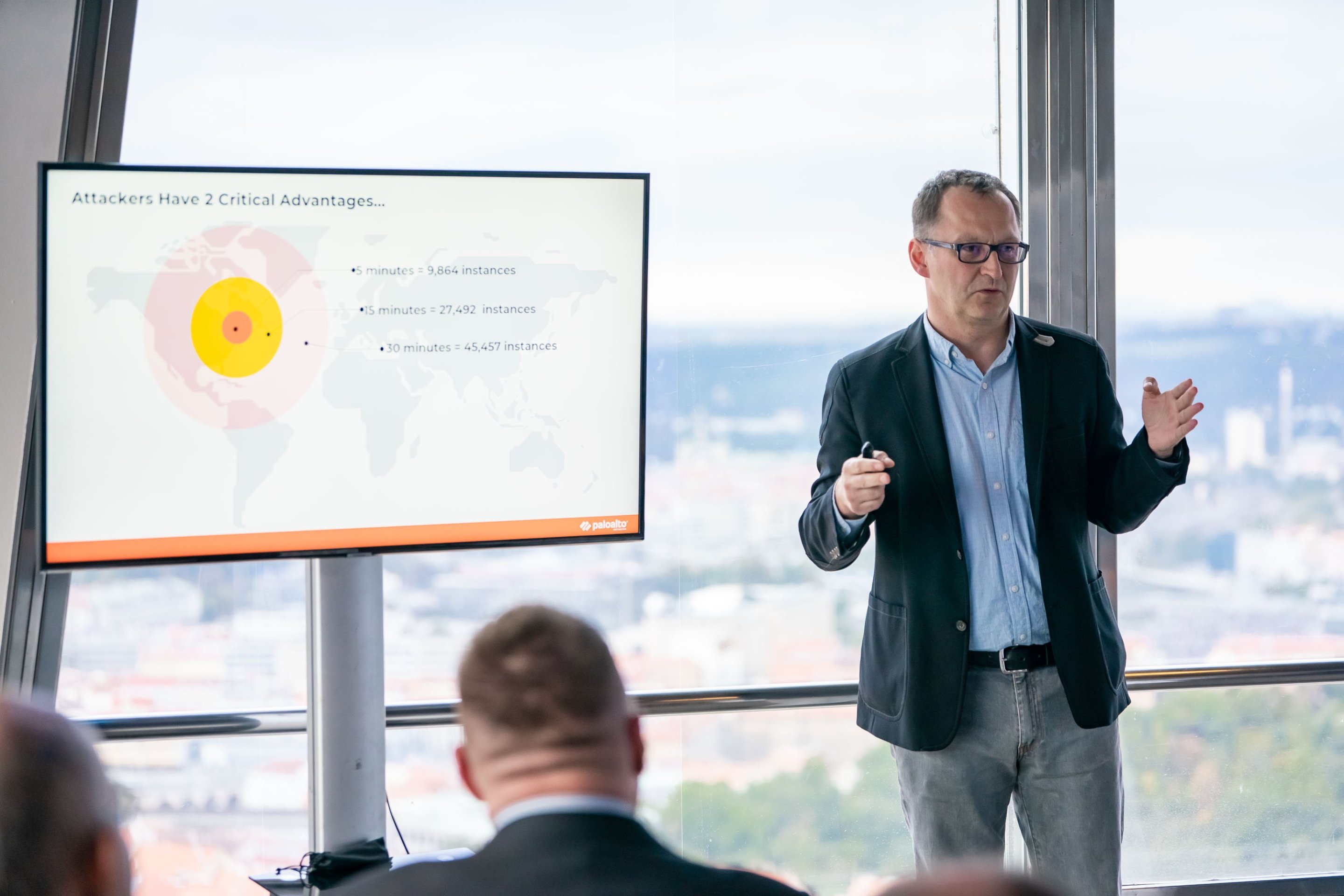 Účastníky přivítal CEO TAKTIKu Petr Belatka a představil firmu a její zástupce. Úvodní prezentace řešení Palo Alto Networks v podání Lukáše Březiny z Taktiku a Jakuba Jiříčka ze společnosti Palo Alto Networks přišla s jiným pohledem na firewall, a sice založeným na řízení přístupu nikoliv na povolování či blokování portů, ale na základě řízení přístupu k aplikacím. Prezentovanou novinkou bylo naplnění souladu s regulačními předpisy zákona o kybernetické bezpečnosti u jednoho českého zákazníka. Nasazením nového brandu Cortex XDR od Palo Alto Networks dosáhli aktivního řešení bezpečnosti, na rozdíl od reaktivního typu SIEM, které potřebuje analýzu posbíraných dat. Cortex XDR řeší incidenty aktivně a do značné míry automatizovaně, předpřipravené a předvyšetřené incidenty předává administrátorovi k vyřízení / zavření.