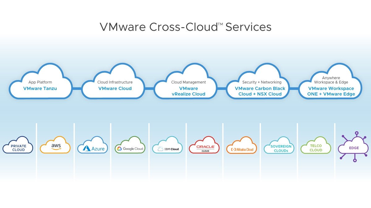 Pomoci zákazníkům uspět v éře multicloudu má za cíl soubor služeb VMware Cross-Cloud, který nabízí tři hlavní výhody: urychlení přechodu do cloudu, nákladovou efektivitu, flexibilitu a kontrolu nad všemi cloudovými prostředími. Služby VMware Cross-Cloud rozšiřují schopnosti portfolia produktů VMware na multicloudový svět a umožňují zákazníkům volit přesně takové služby, jaké potřebují v daném cloudu k dosažení svých aktuálních obchodních cílů. Služby VMware Cross-Cloud zahrnují pět hlavních stavebních kamenů: