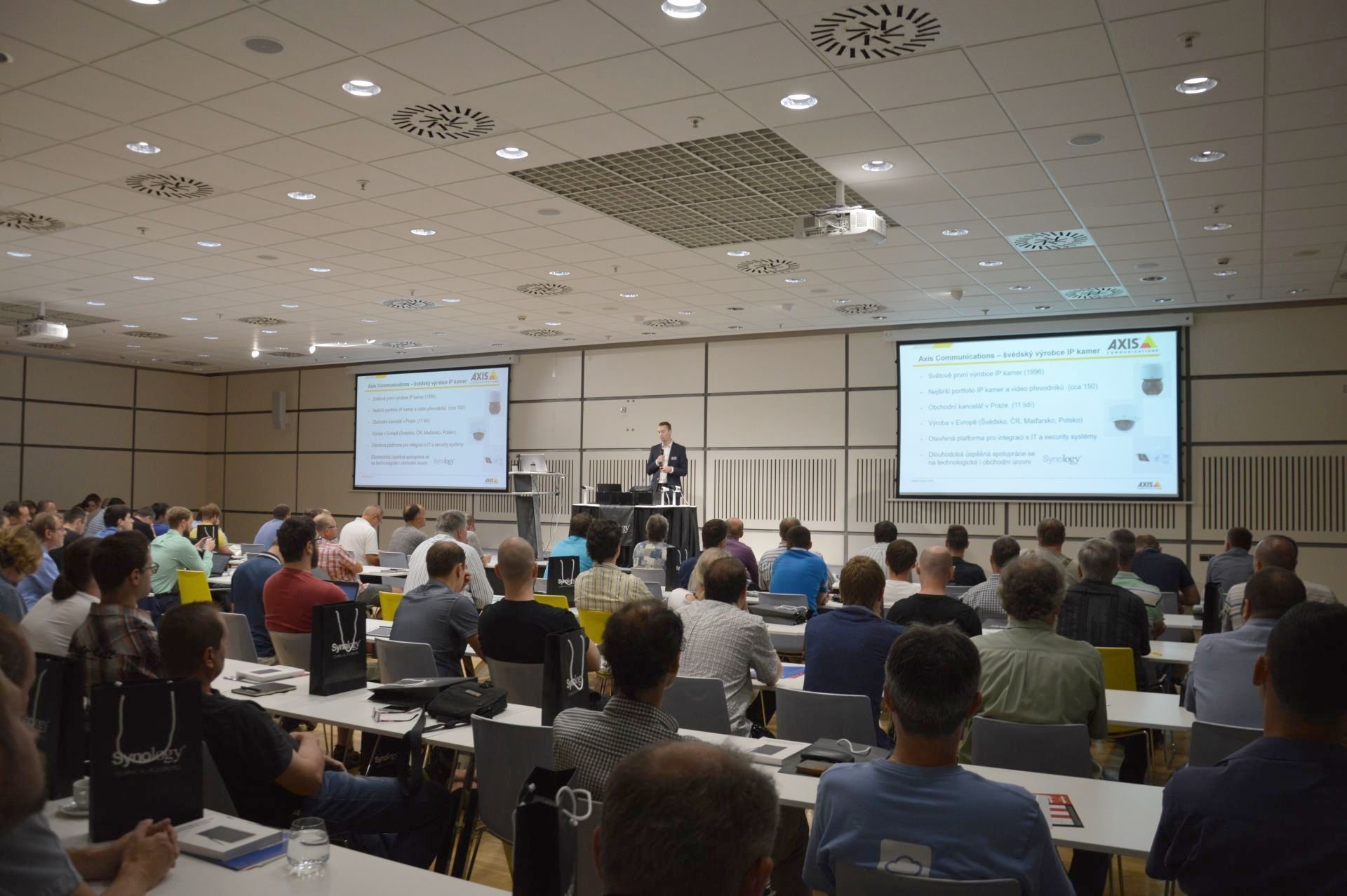 Setkání zahájila Janka Chytráčková, produktová manažerka v Synology, se základními informace o akci. Po krátkém uvítání přítomných a sdělení nezbytných organizačních pokynů následovaly partnerské prezentace společností Axis (Jindřich Světnica hovořil například o výhodách řešení Axis a platformě ACAP pro analýzu videa a rozšíření kamer o další aplikace) a Seagate (Marek Řihošek se zaměřil na pevné disky řady IronWolf, které jsou určeny pro nasazení právě v NAS serverech).