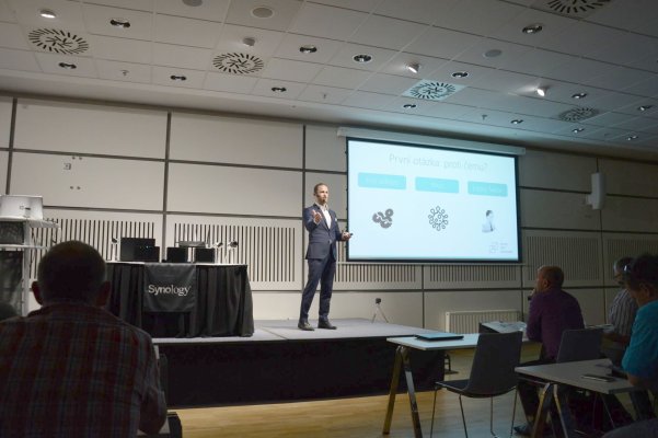 Následoval blok tří prezentací, které postupně na případových studiích a názorných ukázkách nastínily možná praktická řešení požadavků firem ze segmentu SMB z oblasti správy podnikových sítí a ukládání dat, výběru vhodných nástrojů z portfolia Synology a IP monitoringu a inteligentní analýze videa.