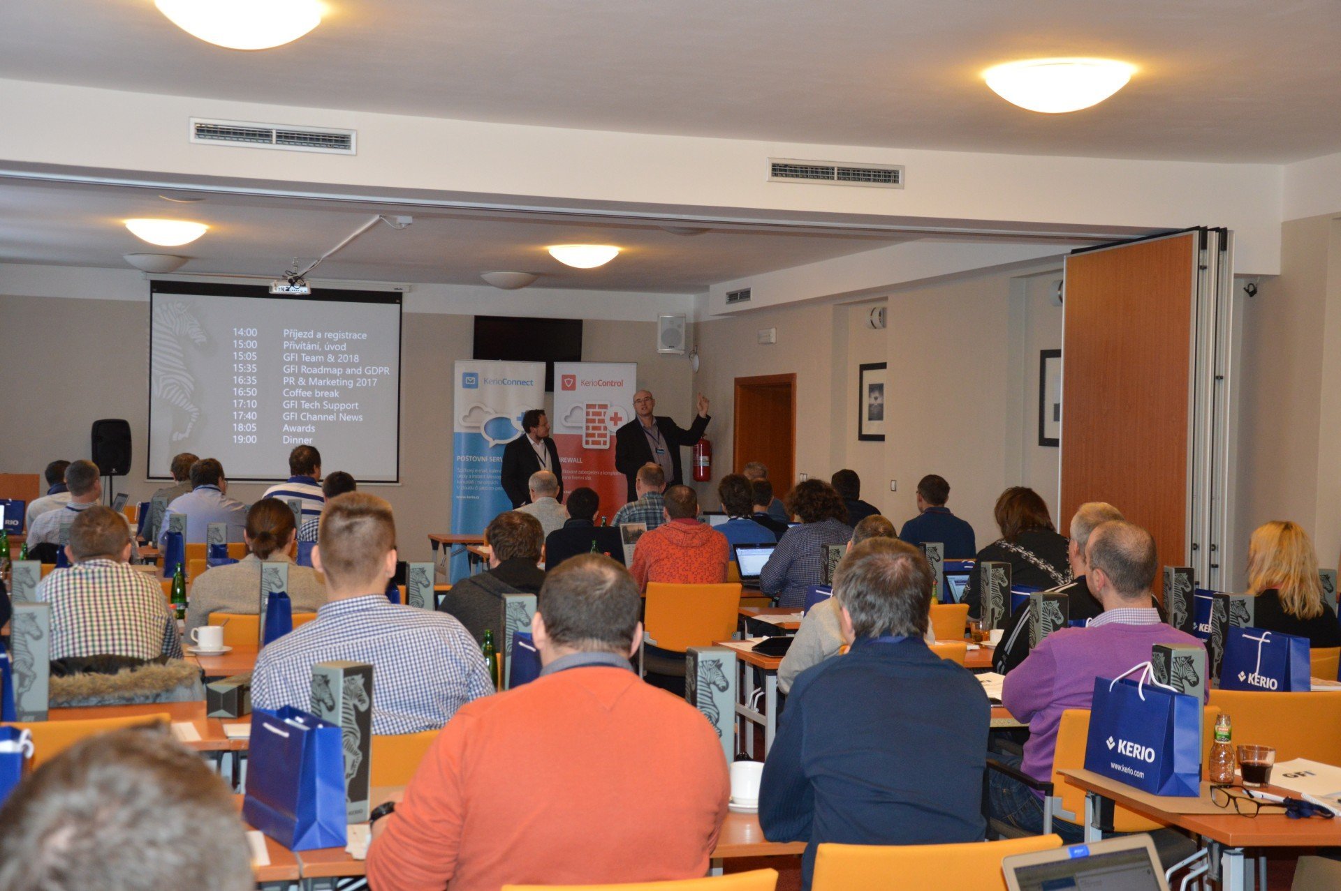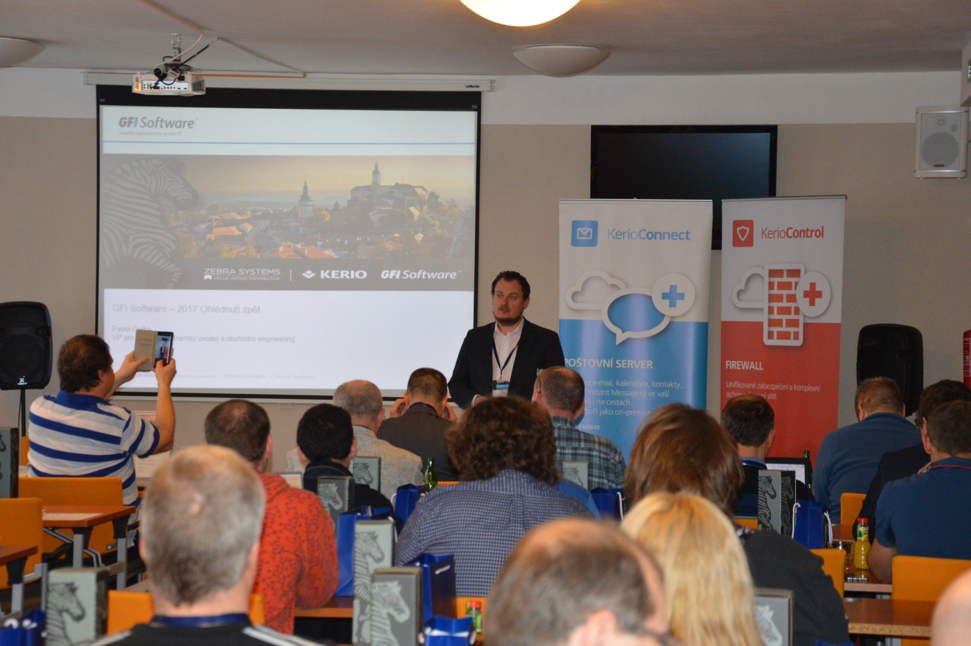 Úvodní pasáž setkání zajistili Zdeněk Bínek, ředitel společnosti Zebra systems, a Pavol Golha, obchodní ředitel GFI pro globální obchod. Pavol Golha shrnul nejdůležitější události z pohledu GFI za rok 2017, pochlubil se velmi zajímavými výsledky dosaženými v loňském roce v České republice a na Slovensku a přispěl také žebříčkem nejdůležitějších produktů na těchto trzích (GFI MailEssentials, GFI MailArchiver a Kerio Control a Kerio Connect).